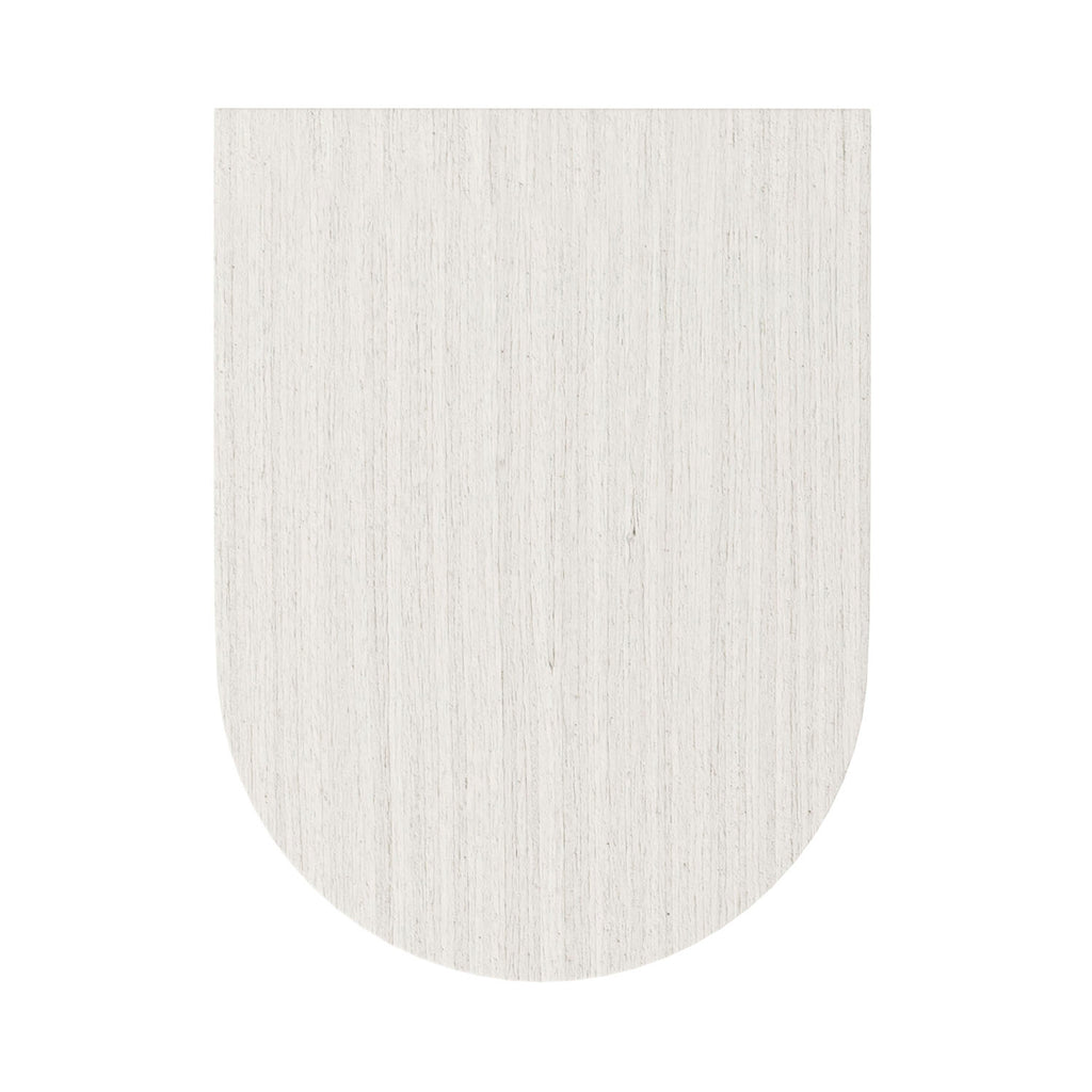 The Stratum side table creates a modern geometric style with a curved top and shelves that are bisected a straight center panel and back, all in Mist finish.