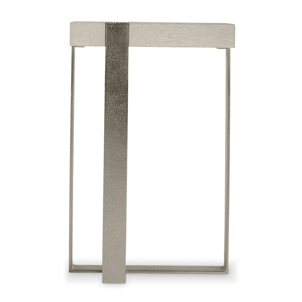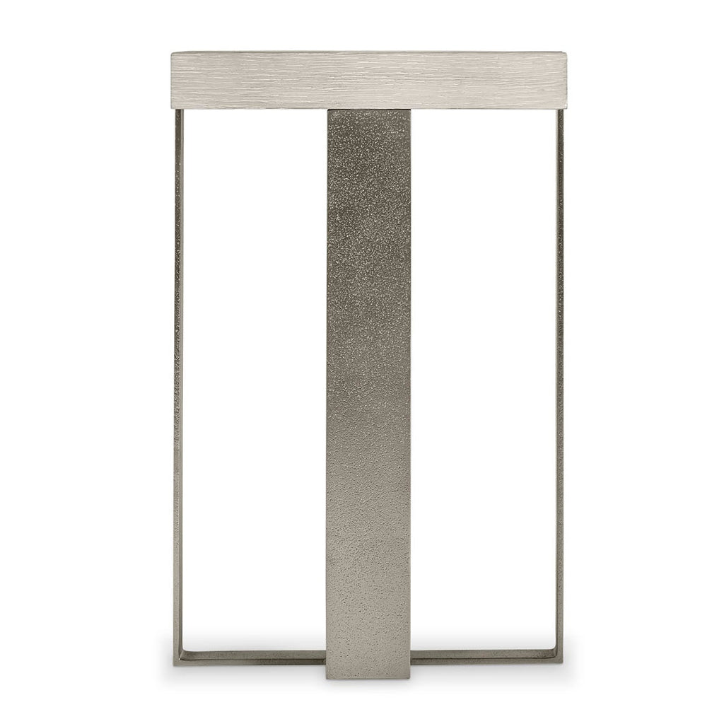Bands of sandblasted aluminum intersect to form the base of the Tempo accent table. One band wraps through the table's top, which is wirebrushed oak in Larza finish. The architectural design is both casual and refined.