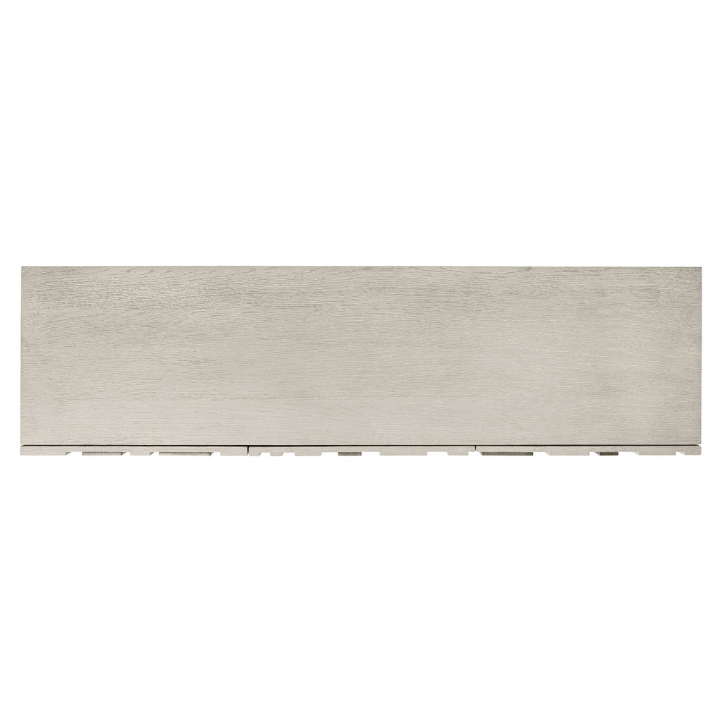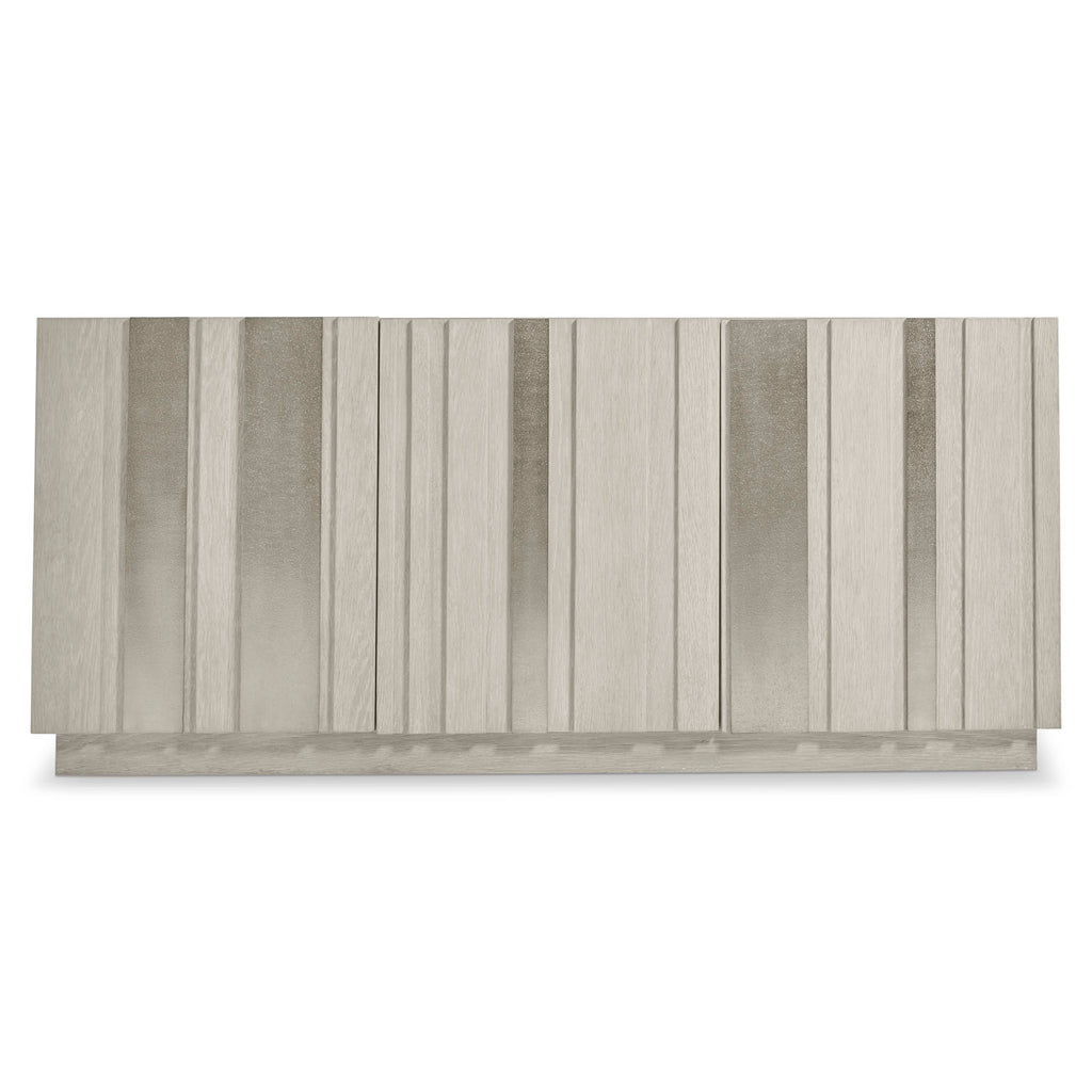 A pattern of metal and wood offers an interplay of light and shadow on the Tempo buffet. Three raised-panel door fronts have sandblasted aluminum overlays in Satin Nickel finish over wirebrushed oak in Larza finish. Resting on a plinth base, the buffet includes one interior drawer and four adjustable shelves.