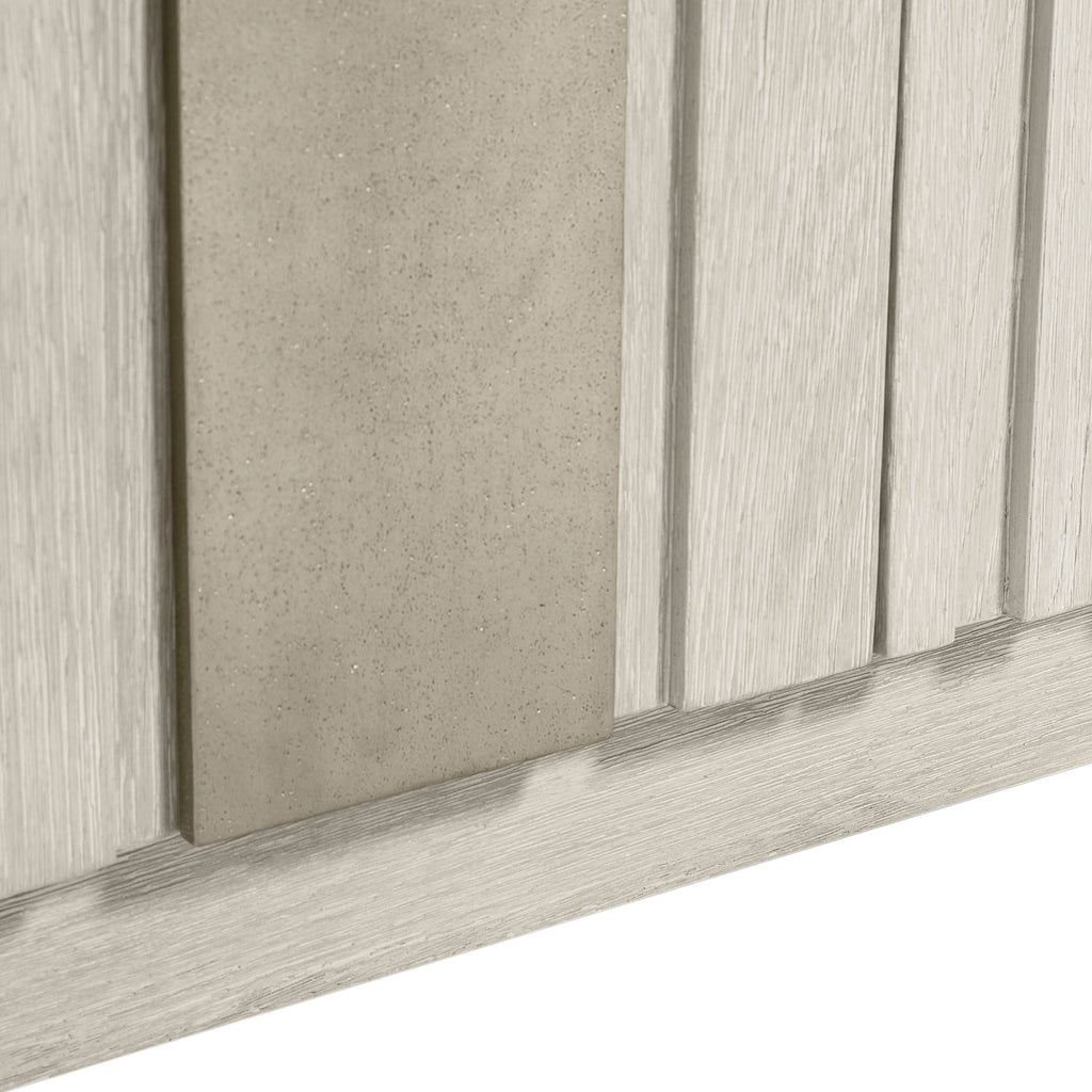 • Wirebrushed oak in Larza finish with smooth top and raised panel door fronts with random sandblasted aluminum overlays in Satin Nickel finish