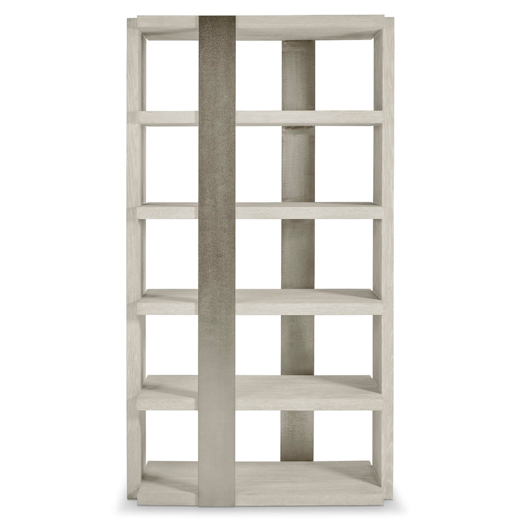An open architectural design creates a sense of lightness in the Tempo etagere. A band of sandblasted aluminum in Satin Nickel finish wraps around the front and back. The structure and five fixed shelves are crafted from wirebrushed oak in Larza finish.