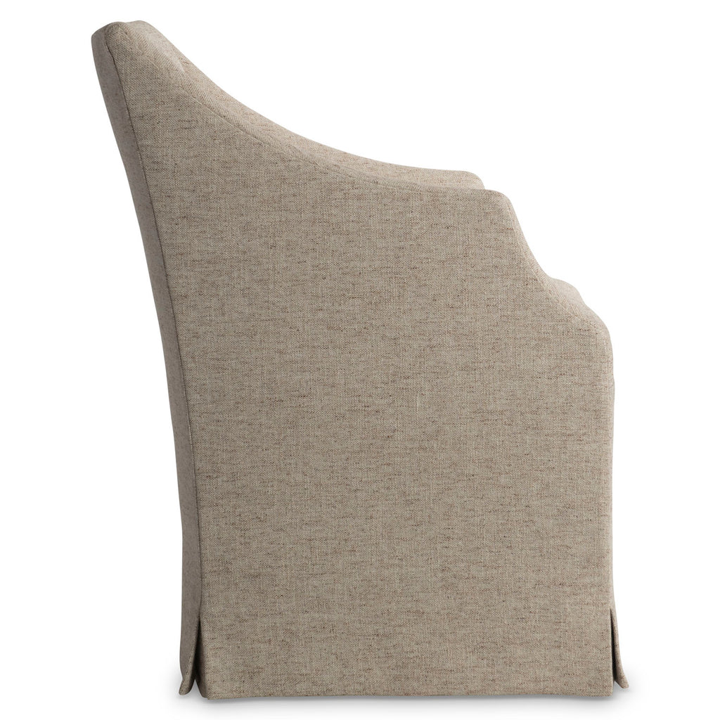 Traditional forms pare to clean lines for the Tribeca arm chair. Curved arms complement the straight lines of the seat and base. A relaxed slipcover style offers a skirt that covers ball casters on the base.
