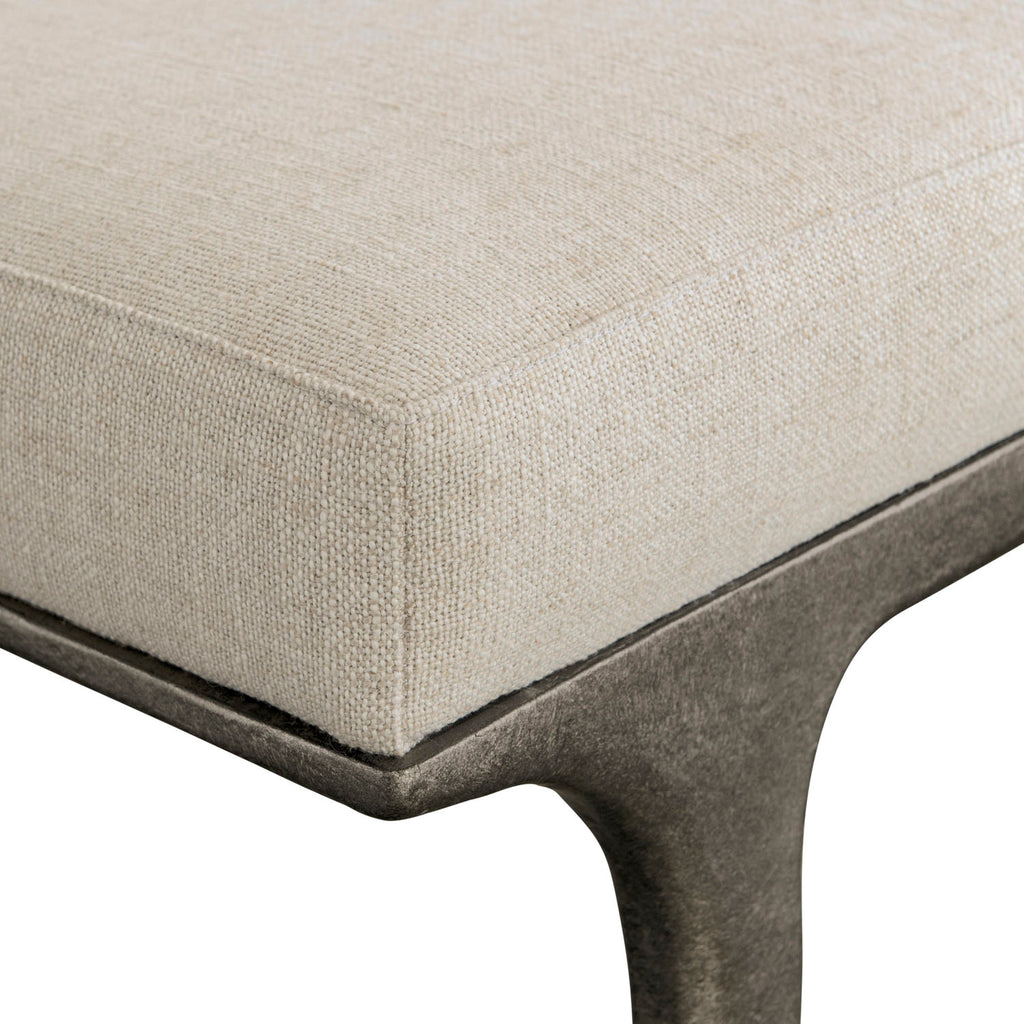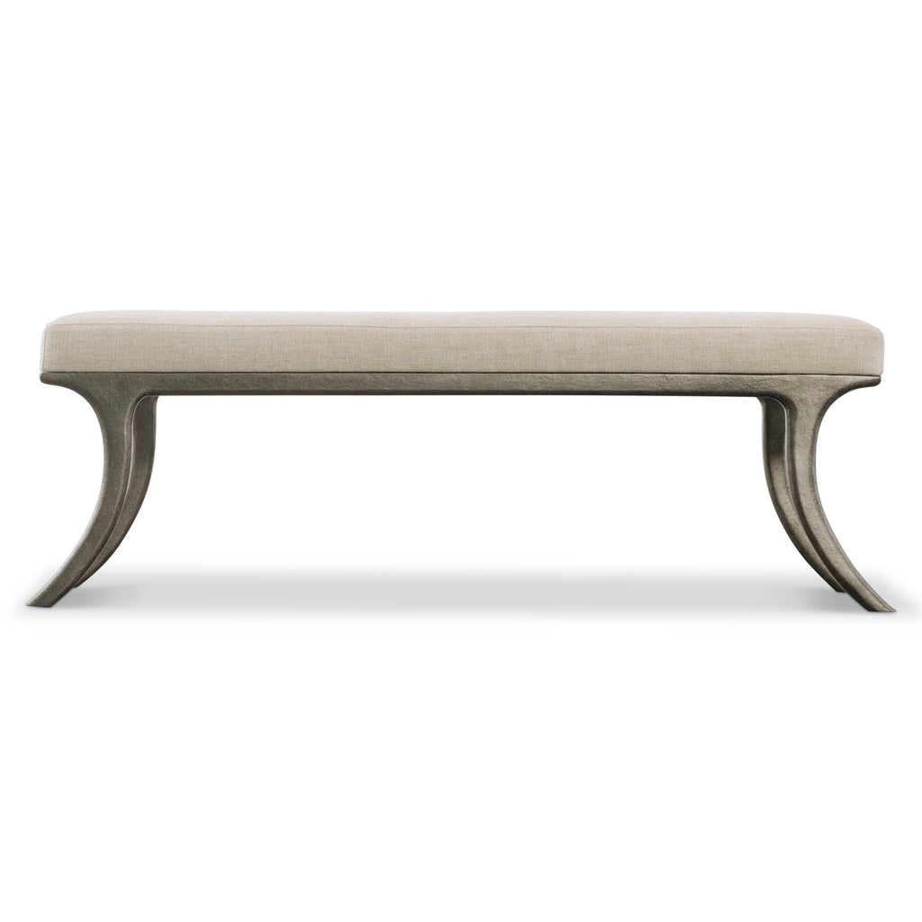 The curved legs and upholstered seat of the Tribeca bench call to mind traditional forms, but the design is reimagined with a textured steel base that offers a more modern and minimalist look.