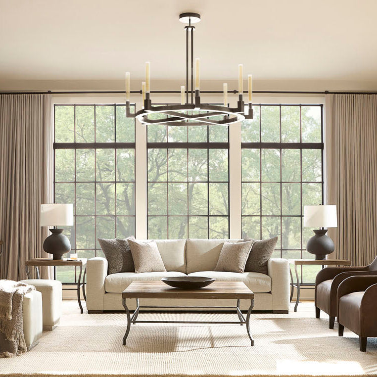 A wire-brushed top on the Tribeca cocktail table highlights the natural details of the wood, finished in Aurum. It offers a beautiful counterpoint to shapely steel legs connected by stretchers in Barlow finish.