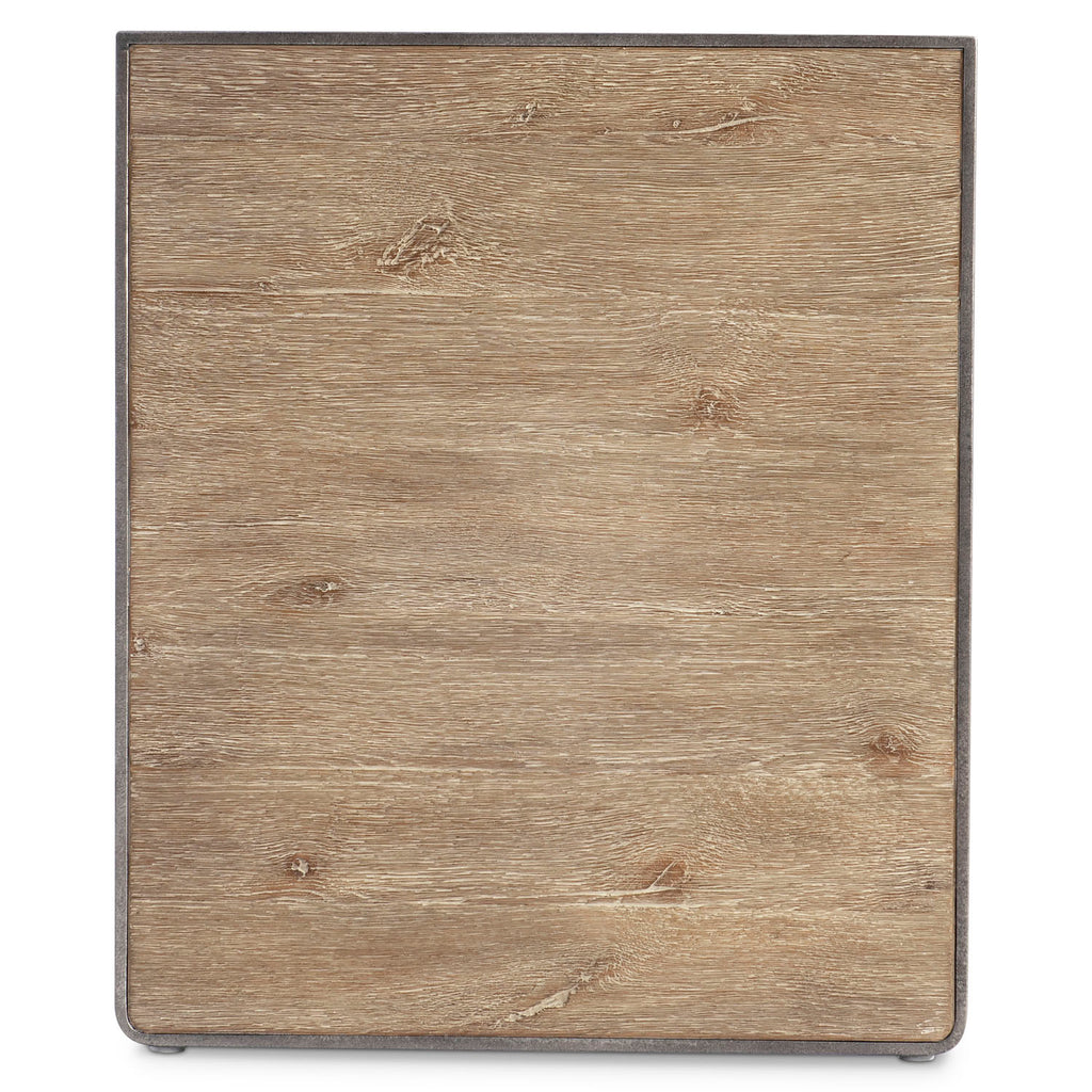 • Oak case in Aurum finish, supported by oak end panels in Aurum finish, framed by textured steel in Barlow finish with stretcher in Barlow finish