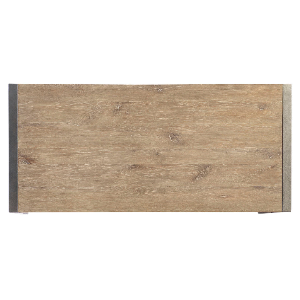 The Tribeca desk melds modern inspiration with rustic styling for a stunning design. Textured steel frames wood panels on either side of the distressed wood desk top. Visible natural features of the wood add authenticity in the Aurum finish.