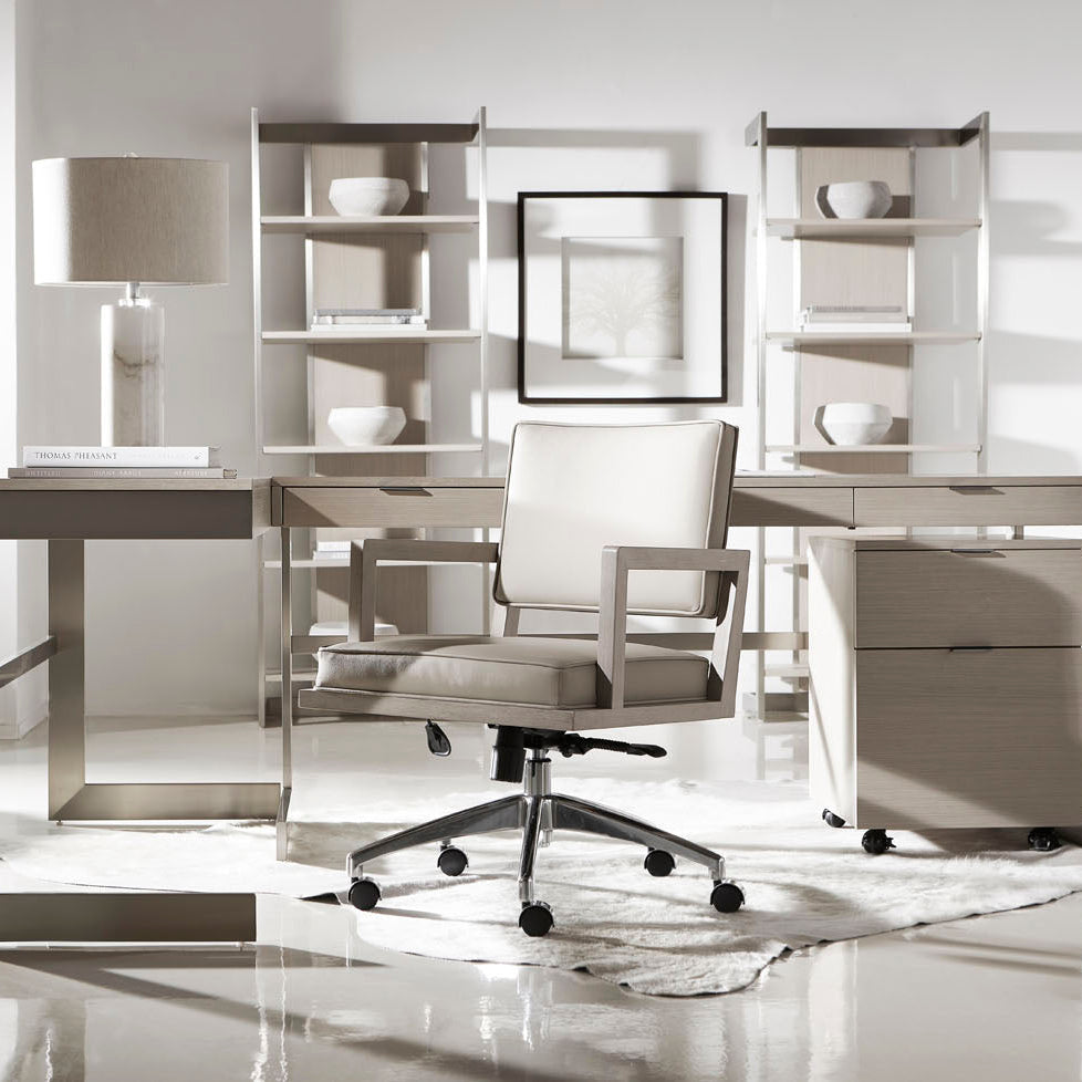 Bernhardt Workspace blends minimalist profiles and sophisticated finishes with a chic, modern feel. The Axiom etagere has a clean, airy look thanks to open shelving and an open metal framework. Five wood shelves offer plenty of space for storage and display. A center back panel showcases the linear wood grain of the veneers, while the stainless steel frame shimmers in Brushed Silver finish.