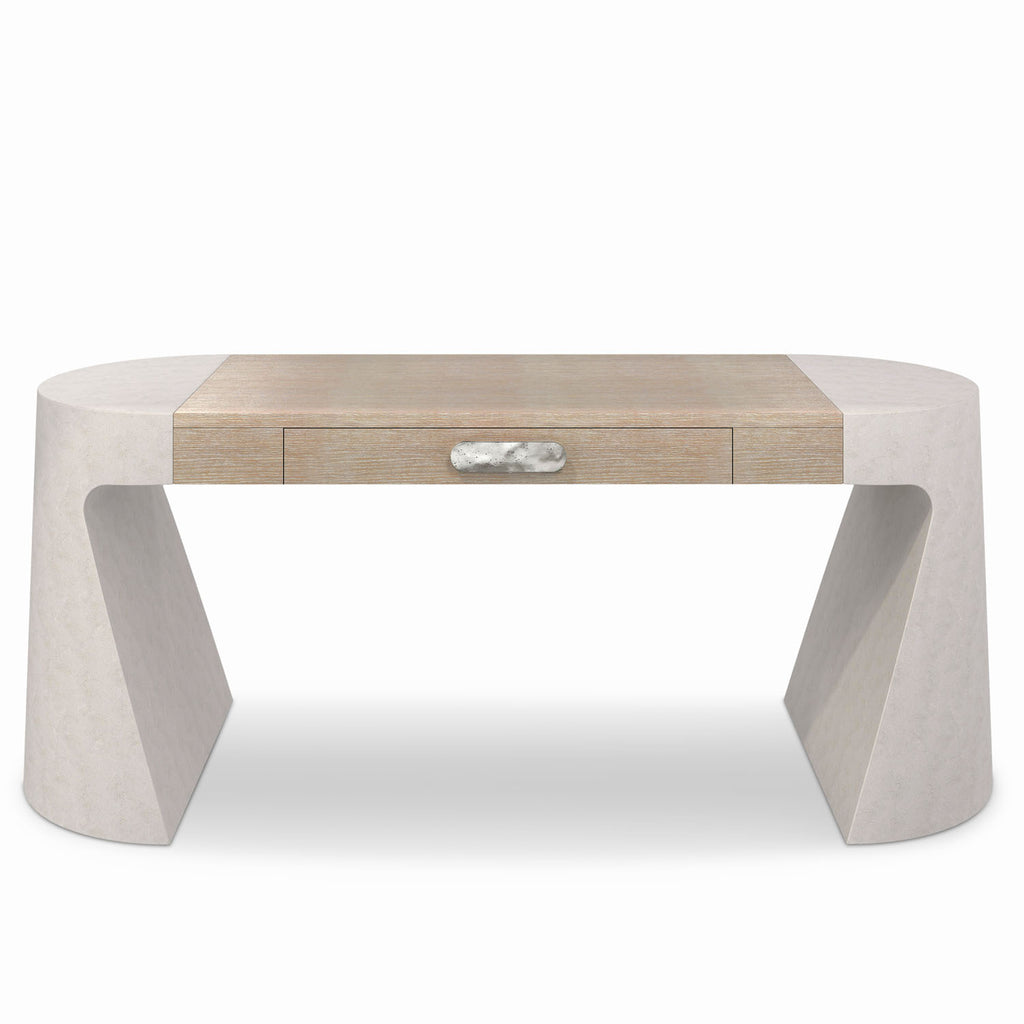 A bold structure is constructed of wood and concrete for the modern Prado desk. Angled and semi-circular legs make a sleek statement in cast glass-reinforced concrete in Buff finish. They support a center wood top in the Tawny finish with a center drawer. A power receptacle with two outlets and two USB ports is available out of sight, underneath the desk.