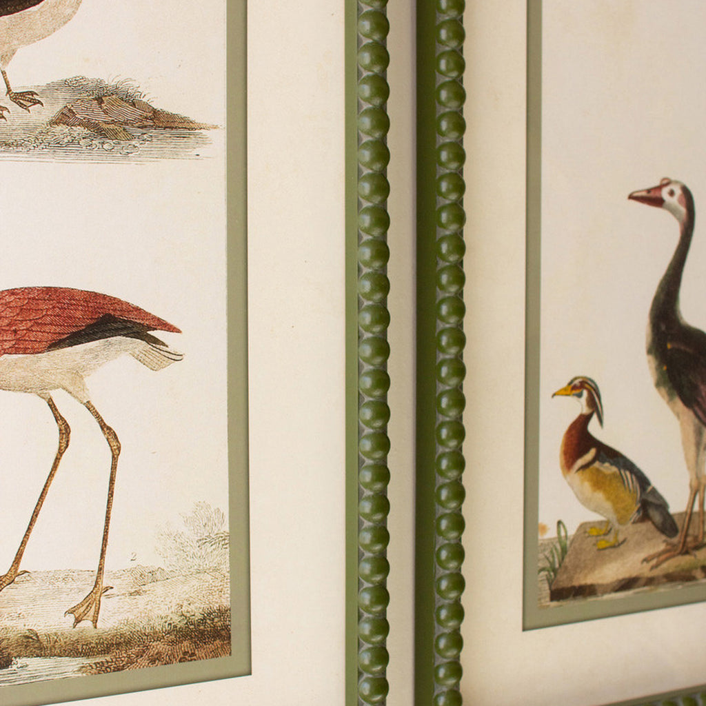 This set of two bird prints under glass features five feathered friends in various attitudes. Simple black frames and light mattes enhance the colorful birds. Suit spaces from seashores to office waiting rooms and everything in between with this simple set.