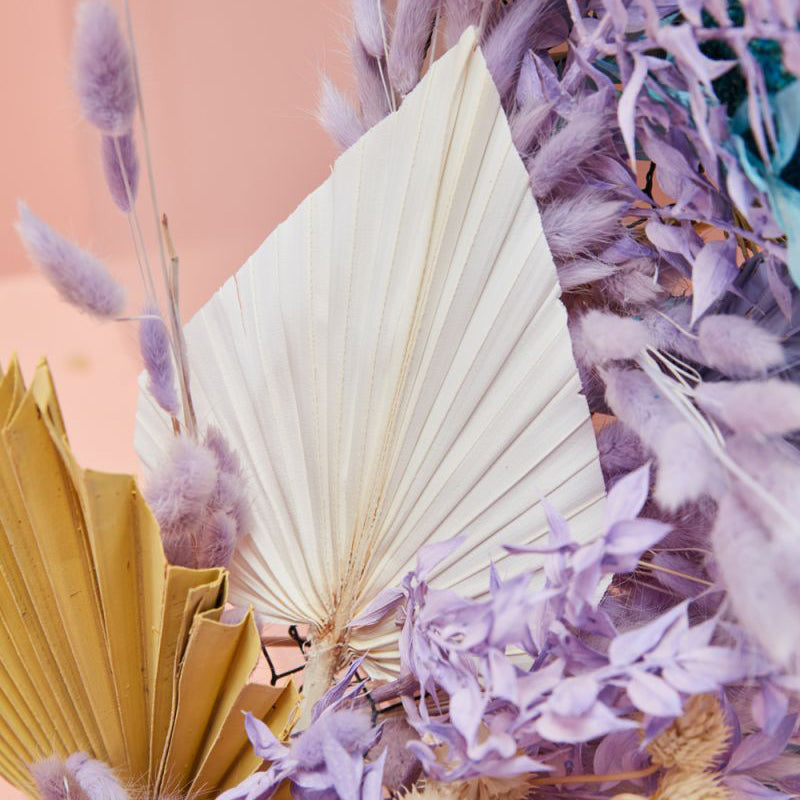 Create whimsical, botanical bouquets with preserved florals, like the pack of 5 Painted Palm Spear. Featuring sturdy stems trimmed into palm spear shapes & dyed white, these textured, trendy pieces add a playful element to floral design & can be reused many times (expect some variation in color & palm spear size). Layer with our other dyed or neutral dried florals for a forever arrangement.