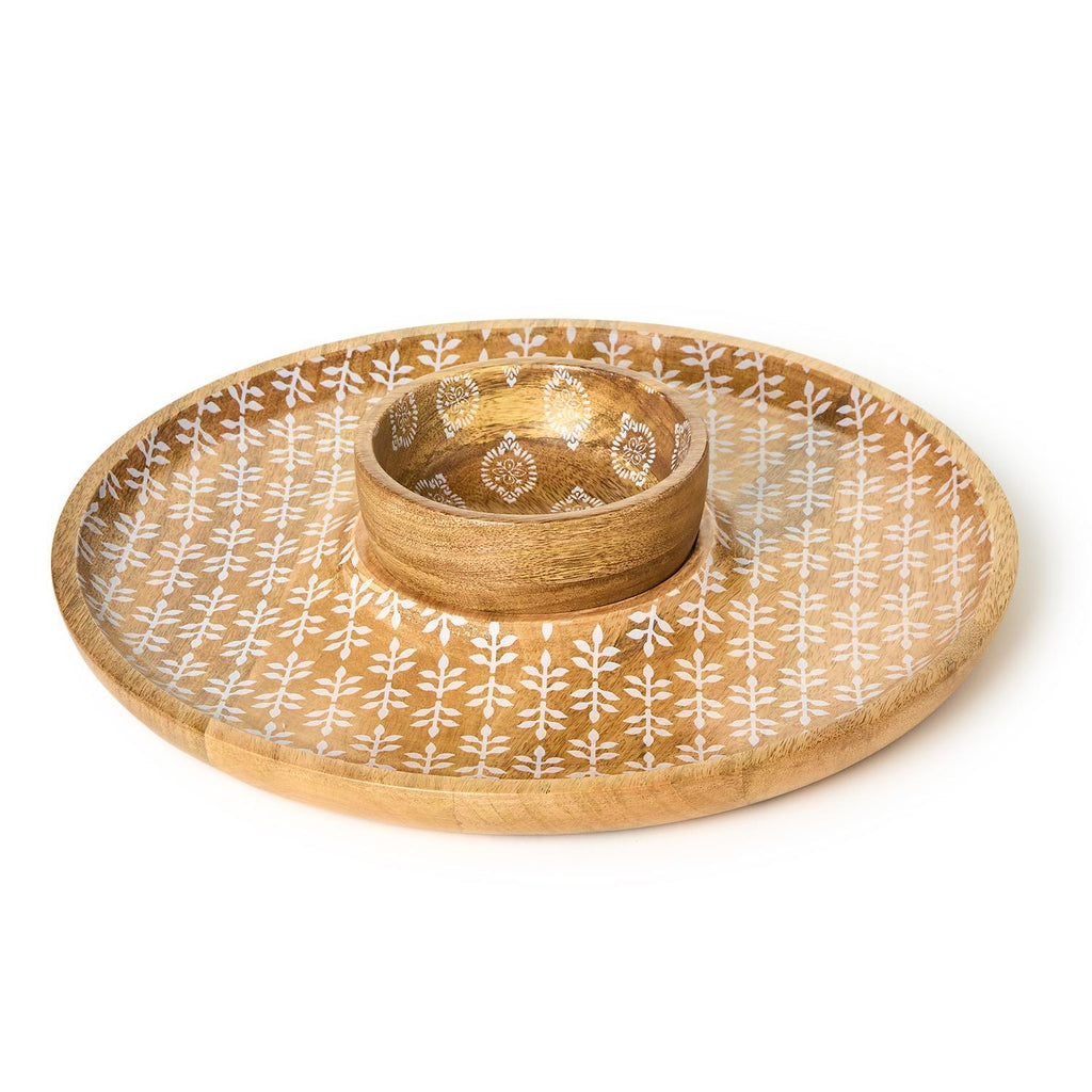 Elevate your entertaining experience with this two-piece chip and dip set. Hand-crafted from mango wood with an elegant block print design, this set effortlessly combines functionality and artistry. The removable bowl adds versatility, allowing you to easily replenish snacks without disrupting your presentation.