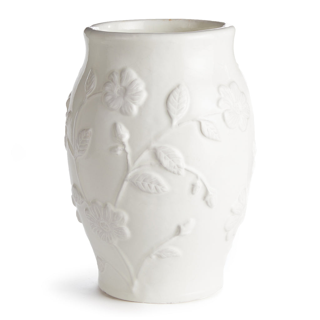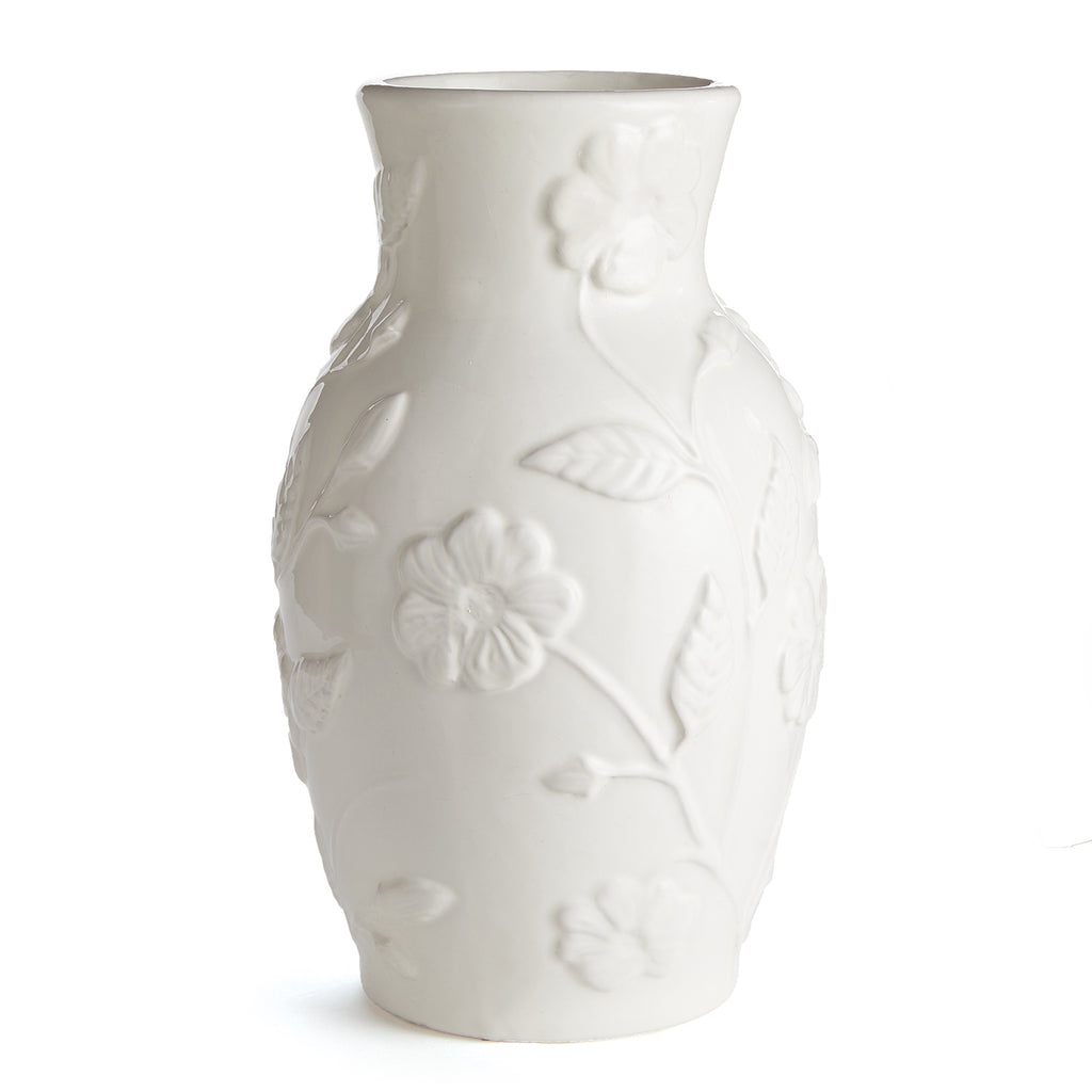 With a low relief floral stem design, this unique Blossom Vase is a beautiful addition to the formal space. A glossy bright white glaze and classic shape make it an instant classic. Fill it with your favorite fau x stems, or just display as is for an elegant look.