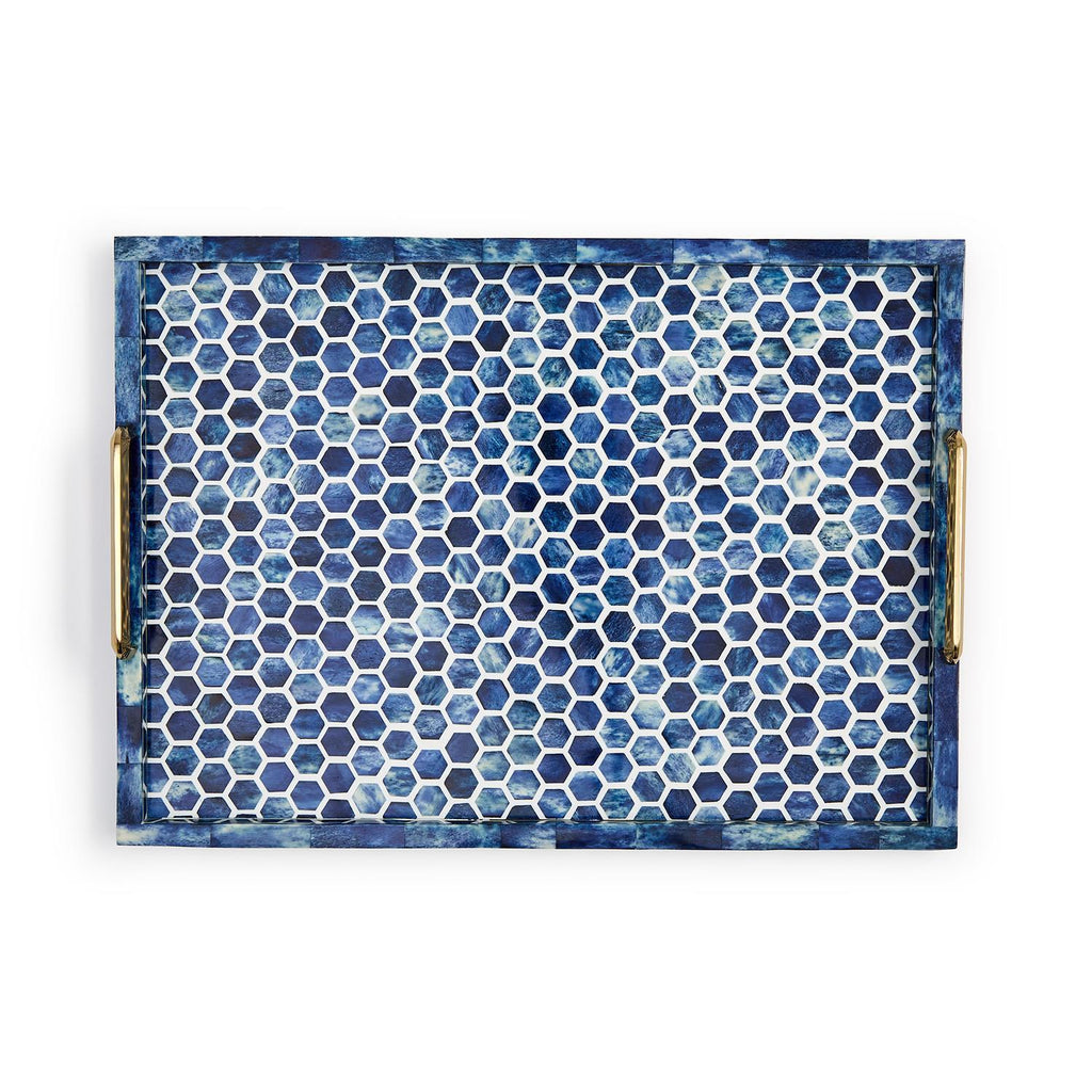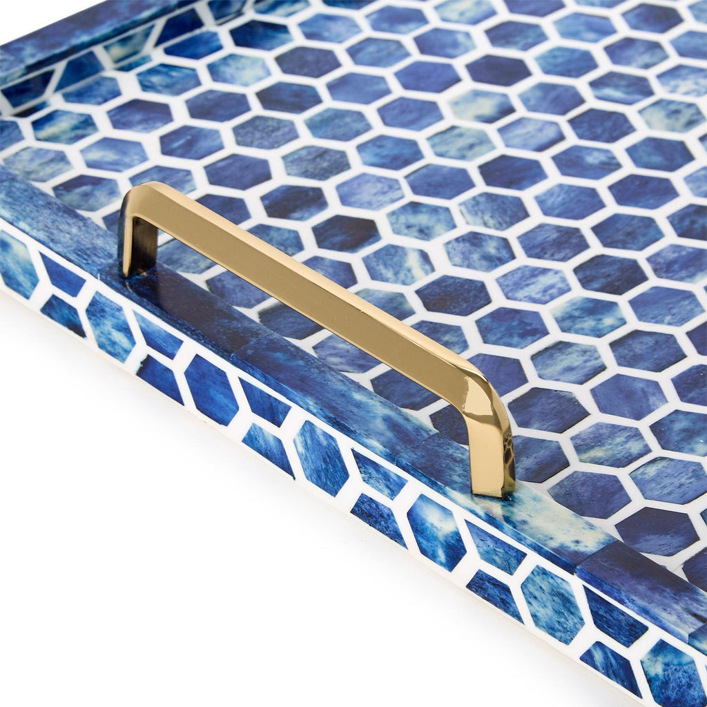 Elevate your entertaining with the Franchetti Blue/White Inlaid Decorative Rectangle Serving Tray. Handcrafted with a blend of MDF, bone, resin, and brass, this exquisite piece exudes artisanal charm. Perfect for serving drinks or displaying cherished items, this tray adds a touch of sophistication to any space.