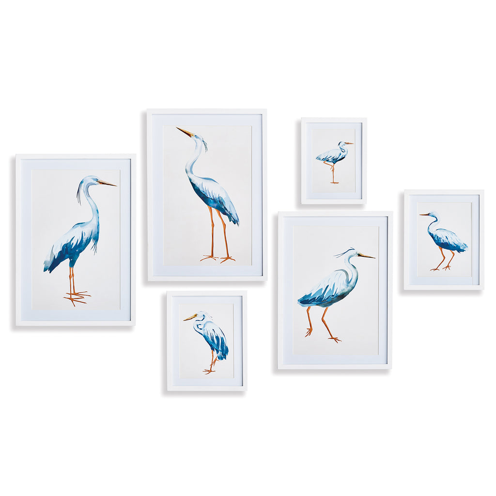 These simplified blue heron prints are complemented with simple white wood frames. This coastal-inspired set of six was carefully curated to create a stunning salon style arrangement, but can also be split up for smaller spaces. A serene choice for home office or study.