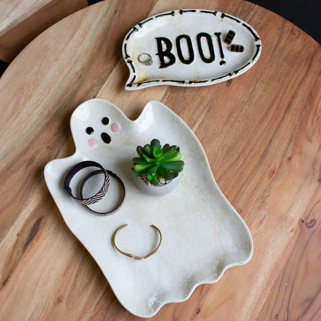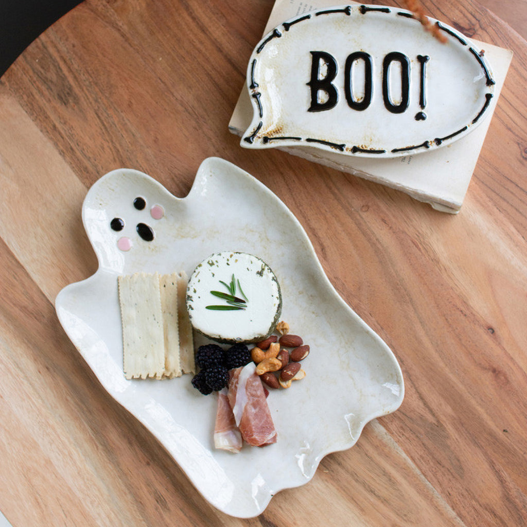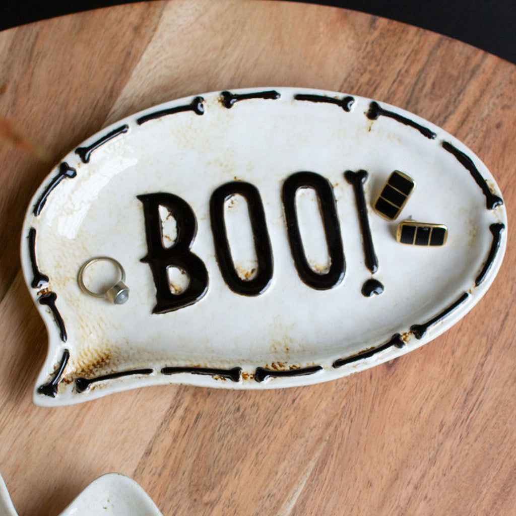 Boo to you! This ghost ceramic serving dish set of two features a scary ghost and his spooky word bubble. Use it to display Halloween treats or keep your candy close by.