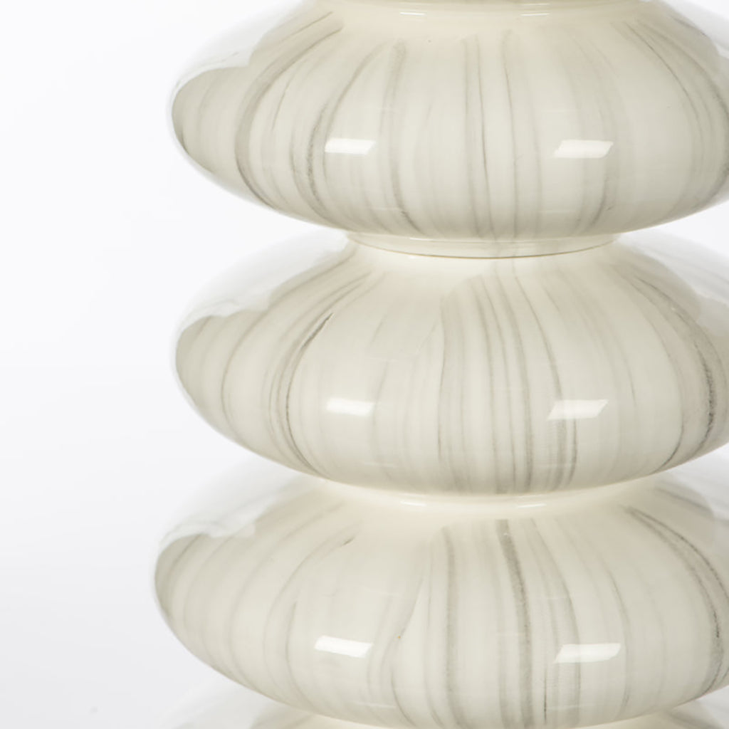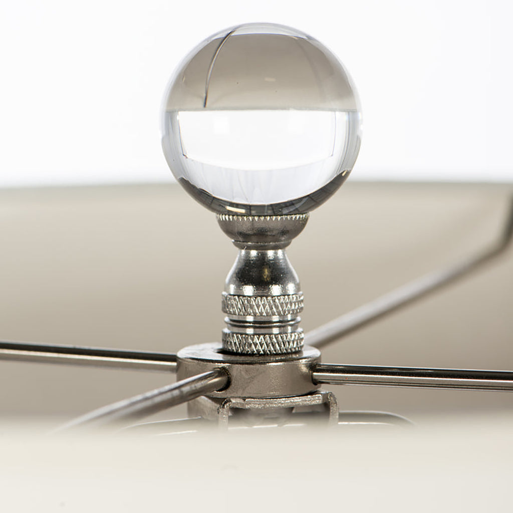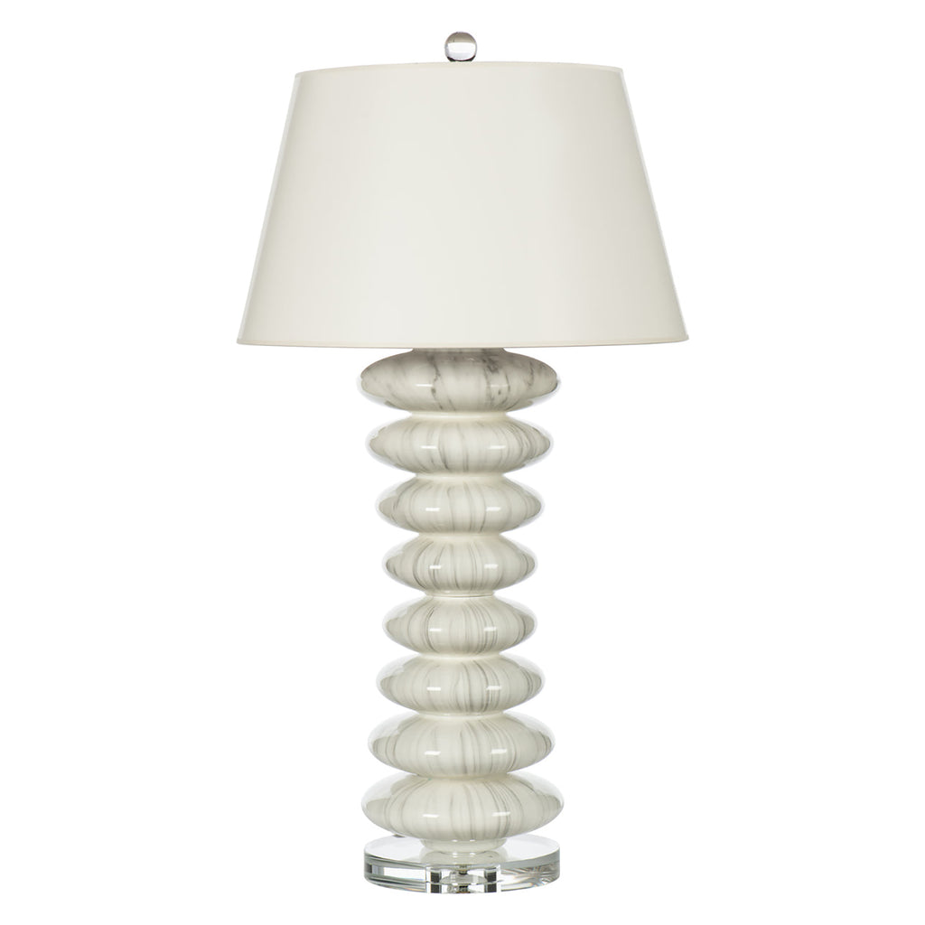 With an eye-catching, eight-tier body made with opulent faux marble, this ceramic table lamp looks elegant atop a sofa table, nightstand, or credenza. The lamp is topped with a soft, gray empire shade and rounded out with a sparkling crystal finial and matching clear base.