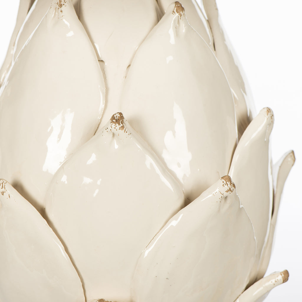 Light distressing perfectly accentuates the leaves of this ceramic artichoke table lamp. A wonderful way to add natural flair and appealing texture, the lamp features an antique-inspired warm white finish and its artichoke body rests on a classic round pedestal base. Its wide sea grass shade adds to the natural, earthy effect of this lovely lamp.