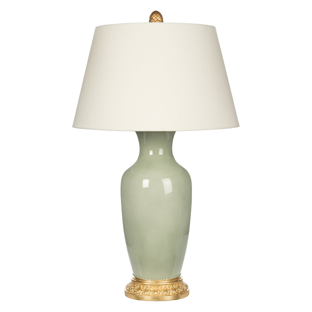 Soft celadon green finish is complemented with a gold leaf base on this transitional ceramic table lamp. The base of the lamp is carved, adding dimension and detail to a classic silhouette. An empire shade on top ensures lovely lighting in any room.