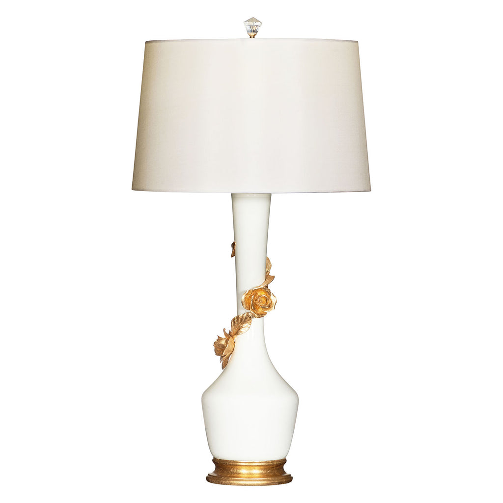A sleek long neck urn table lamp is wonderfully updated with a wrap of molded gold roses, bringing excellent visual and artistic detail. Even the smallest details are remembered with this traditional table lamp, including the drum shade and crystal ball finial for a hint of glam.