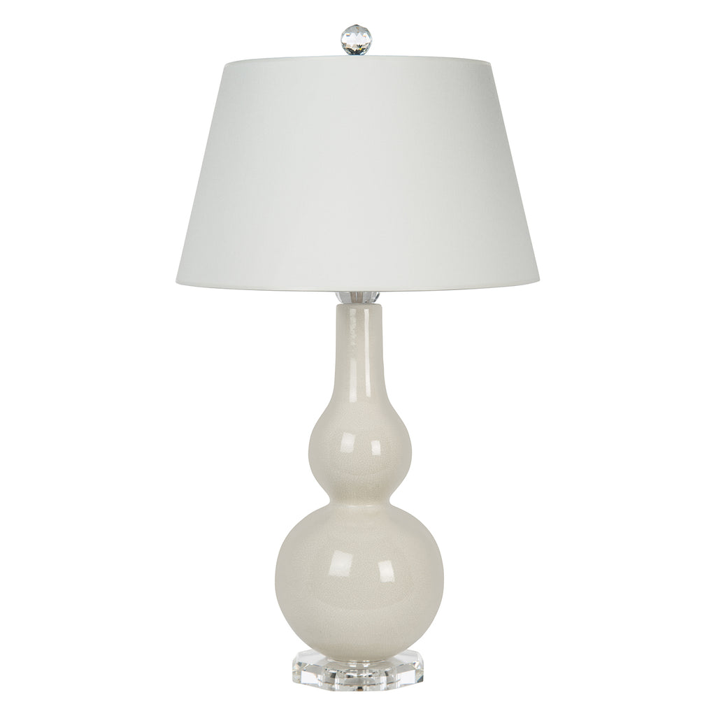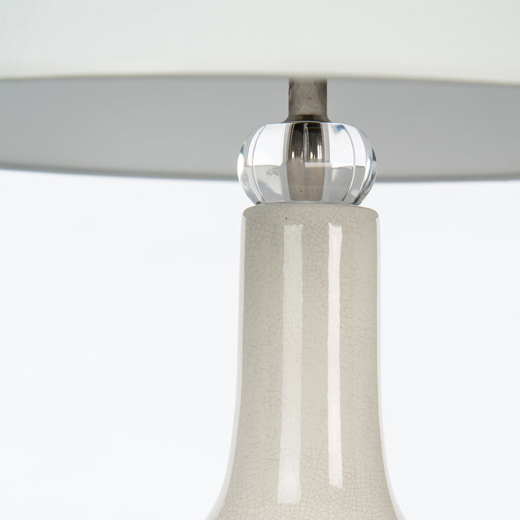 The white crackle finish of this bulbus style table lamp makes heads turn and hearts flutter. Equipped with a crystal neck and base, you can envision this ceramic lamp perched on a console table with the backdrop of a modern cityscape.