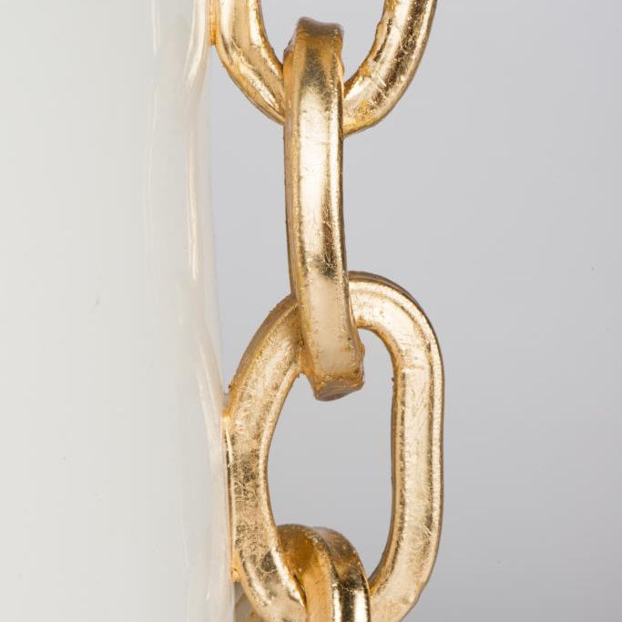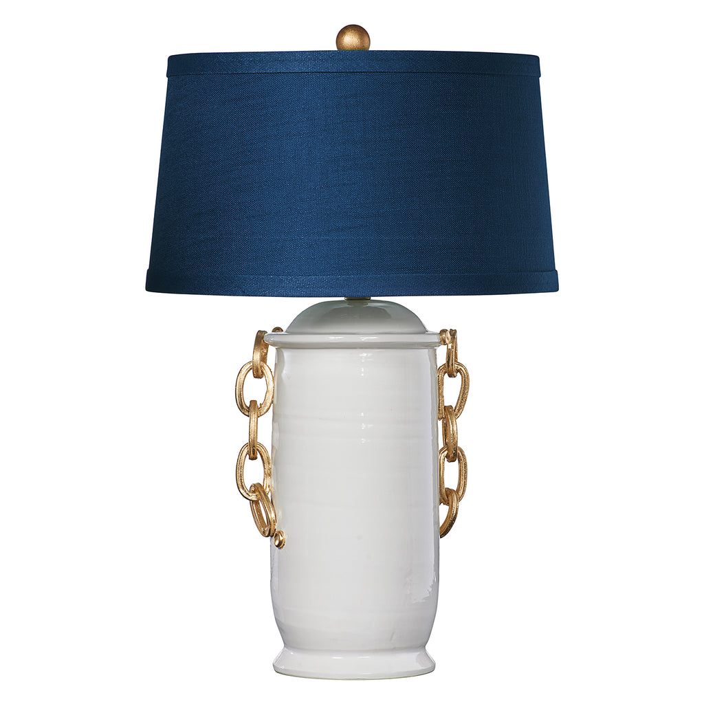Set your sights on a nautical table lamp that incorporates all elements you love about ocean life. Crafted by Italian artists, the beautiful nautical chains are finished in gold leaf while the lamp is accented with a blue drum shade, inspired by the depths of the ocean. This white ceramic lamp is the perfect complement to your coastal decor.