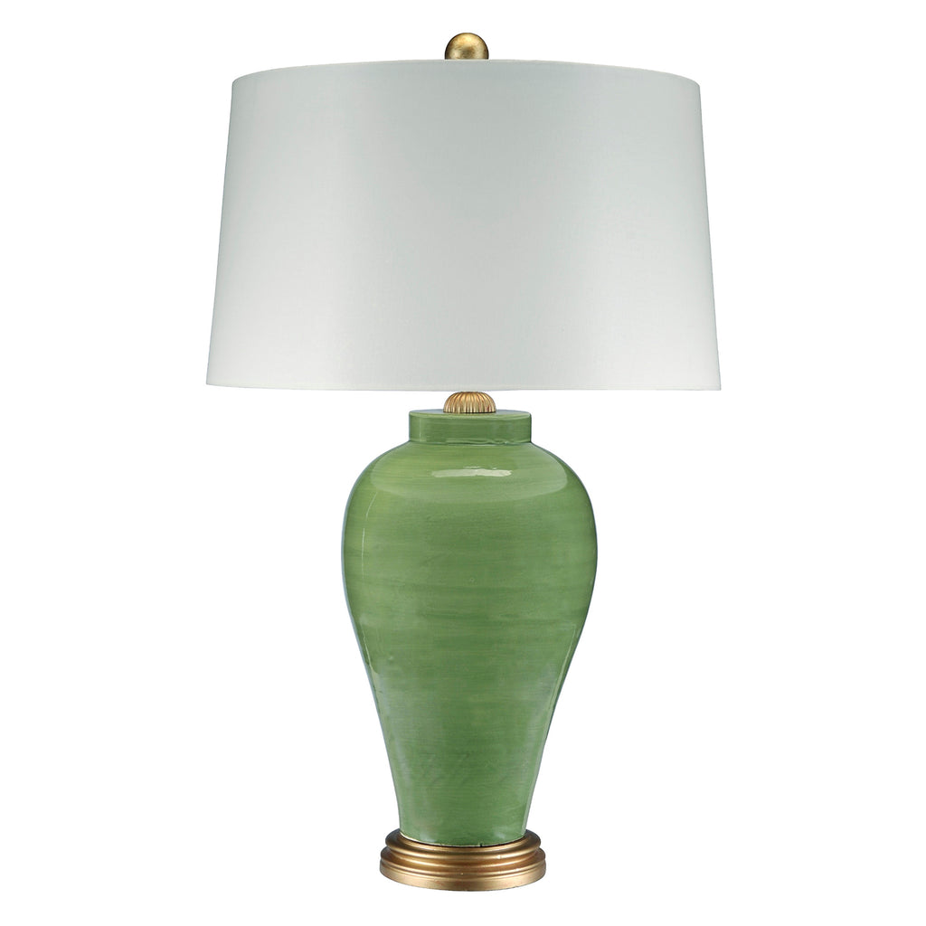 A modern pearl drop table lamp adds posh appeal with its ceramic body and green finish. Adding subtle color when combined with a gold leaf base and matching ball finial, this lamp offers sophistication for seating areas.