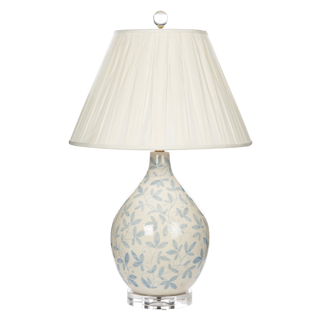 The graceful curves of this teardrop body are accentuated with hand-painted, blue leaves that create a natural look and feel. A crackle finish completes the body while a crystal base and finial add a touch of sparkling personality. A pleated empire shade creates dimension while cream silk creates true, diffused illumination for a side table or console.