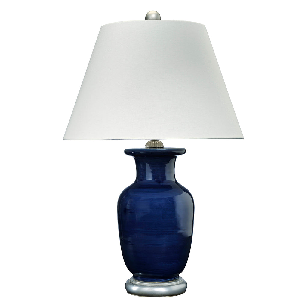 A glowing cobalt blue hand-thrown base is accentuated with distinctive nautical touches in this Italian urn table lamp. A striking choice that adds a rich pop of color to a console or side table, the urn rests on a silver base and offers warm and inviting illumination in a living area or bedroom. It's topped with a linen empire shade.