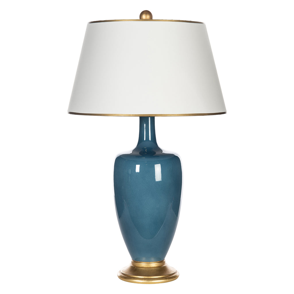 Create a hint of drama with this 30" dark teal tapered lamp with a lampshade made from parchment. Beautifully sculpted ceramic gives an impressionable presence with an antique gold base and matching gold trim along the white empire lampshade.