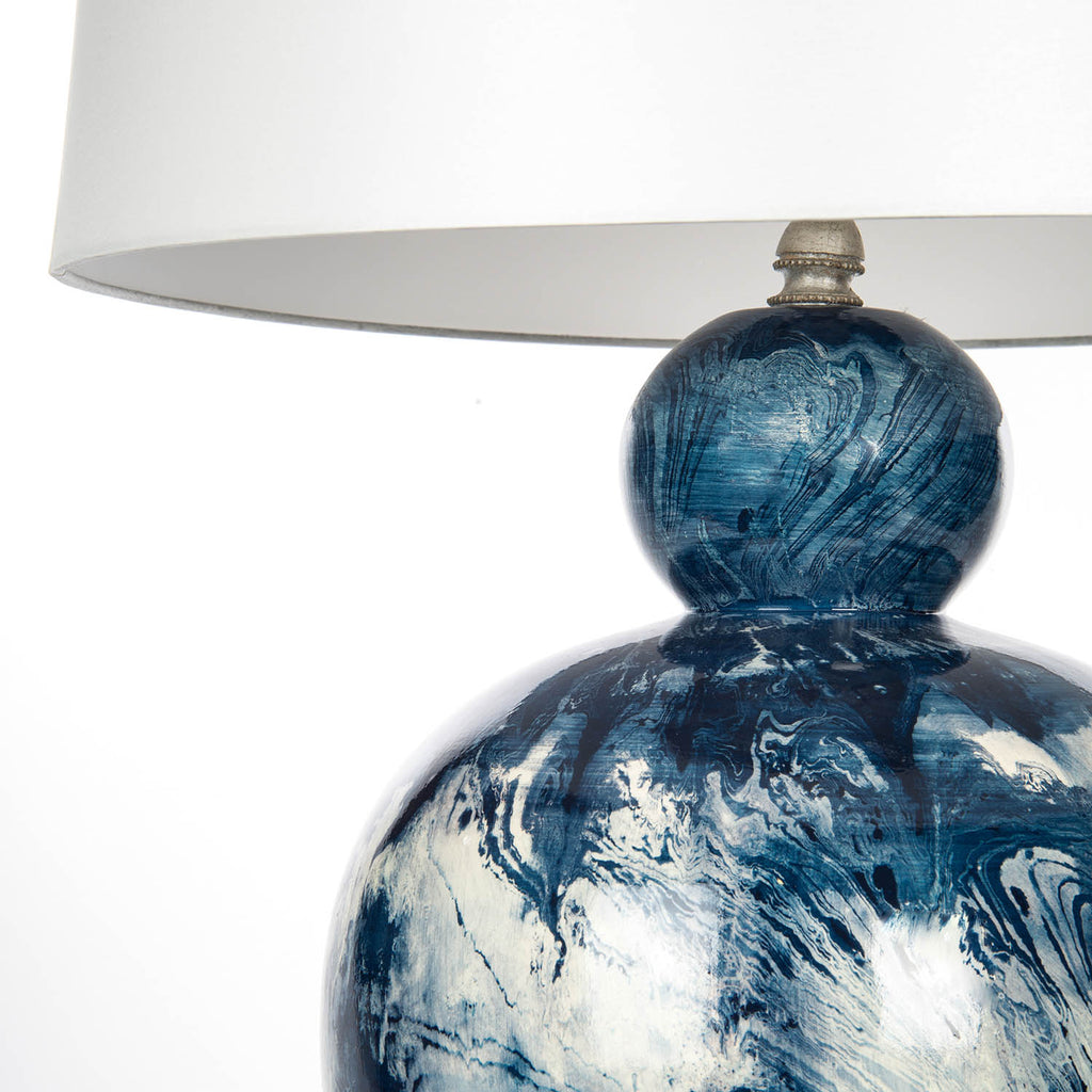Introduce dimensional flair with the striking multi-tonal finish featured on this transitional ceramic table lamp. It shows off a dramatic marbleized blue finish that captures attention while adding color and richness to elegant decor. The lamp rests atop a crystal base and is topped with an off-white tapered drum shade.