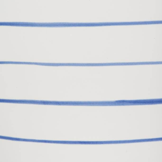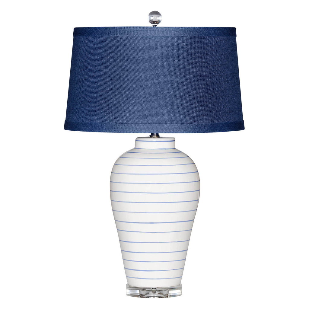 Gorgeous curves and hand-painted blue pinstripes add elegance to the nautical themes of this ceramic table lamp. A pearl drop body is hand-thrown by Italian artisans and set atop a crystal disc base. A blue cotton Blend drum shade completes this contemporary look.