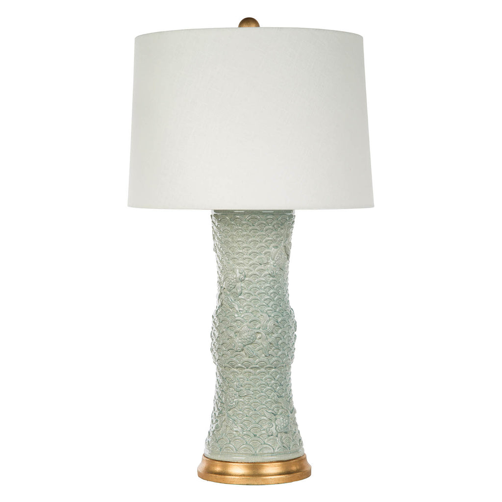 Celadon scales cloak the scattering of koi fish decorating this inspired traditional ceramic table lamp design. Beautifully rich in texture and dimensionality, this lamp is a charming addition, offering a warm touch with an antique gold base and gold leaf finial. It offers soft, diffused illumination with a cream linen drum shade.