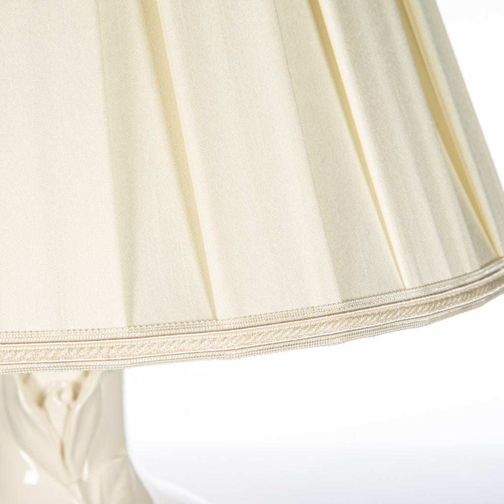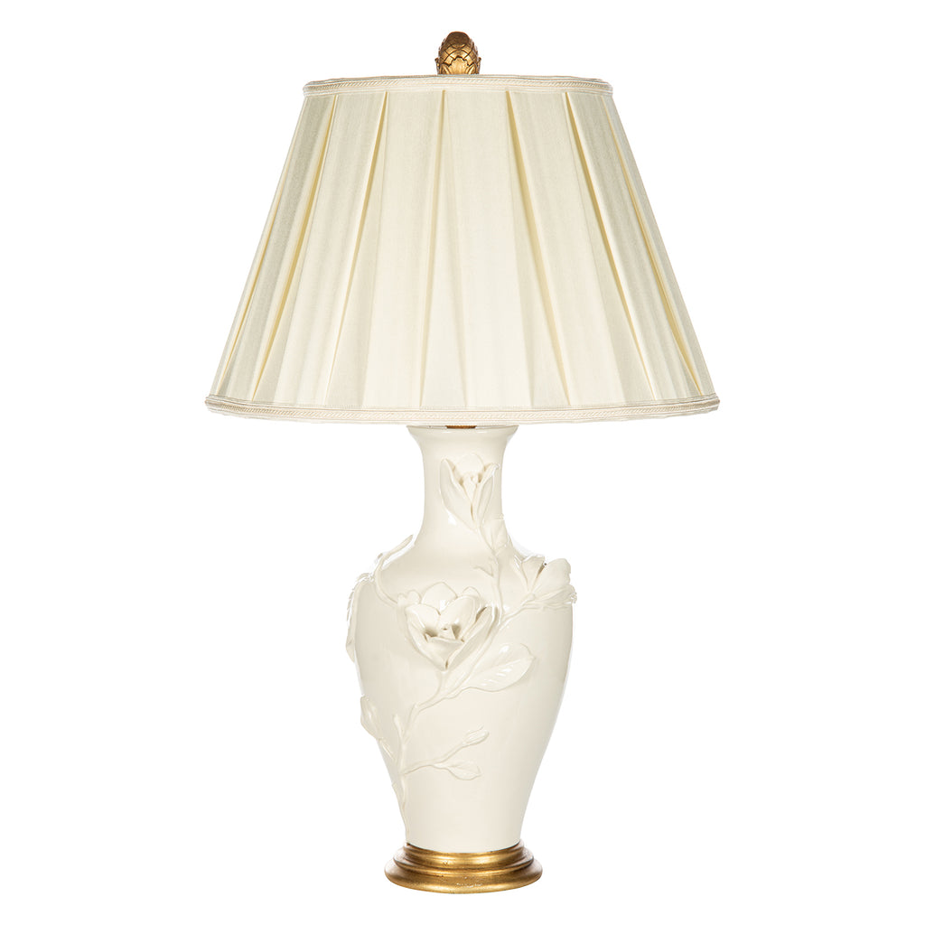 The romance of florals adds texture and style to a lovely table lamp that embellishes a traditional or transitional space. With a ceramic body showcasing large raised magnolia blooms, it delivers on an artistic vibe and features rich golden trim from the base to the shade and finial. The pleasted silk shade really helps this entire unit pop to the eye with the elegance of detail.