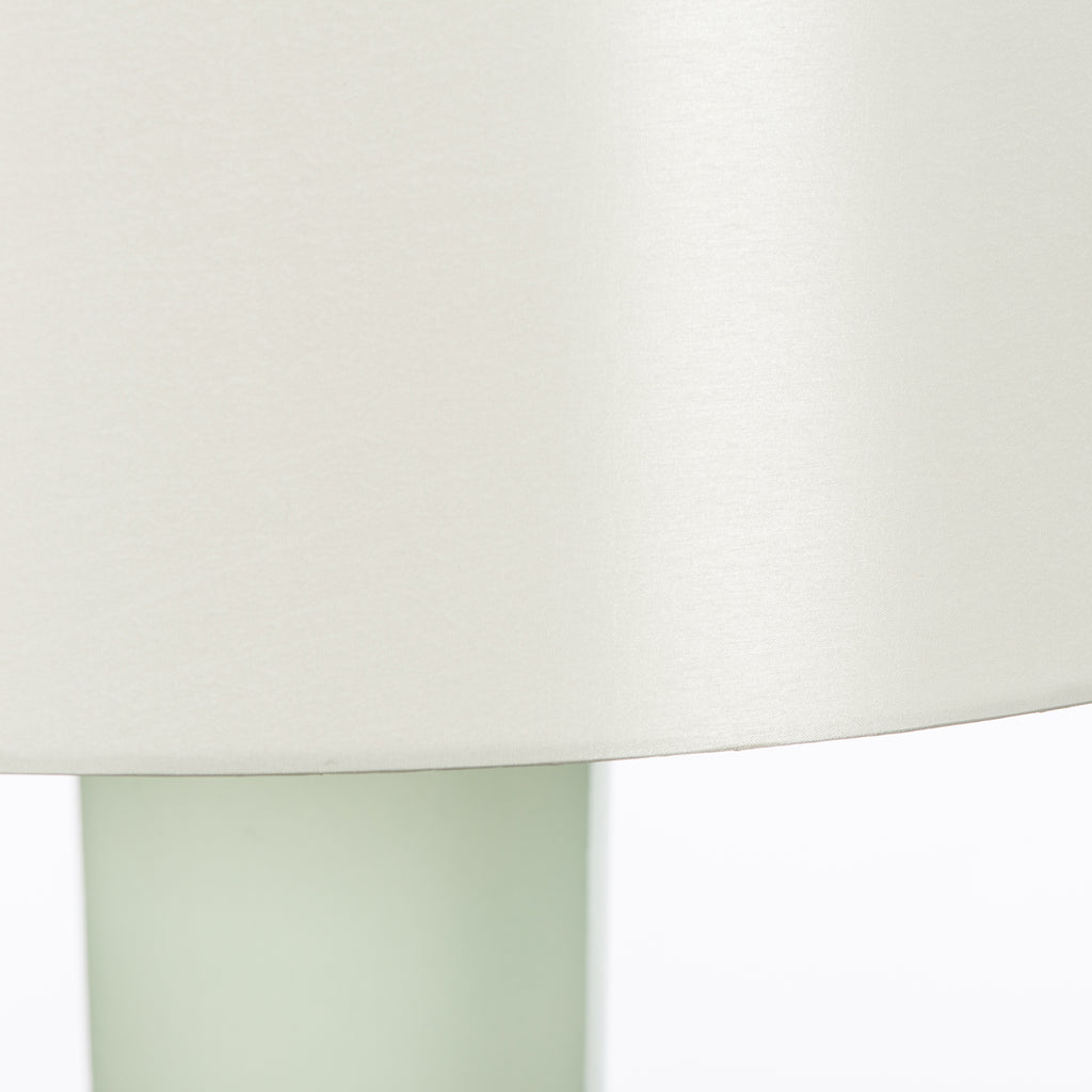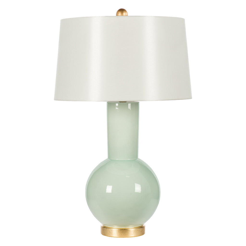 Retro inspiration offers Mid-Century custom glam in a table lamp styled for a casual space. With a long neck, its shapely light green ceramic body delivers a blush of color, highlighted with an antique gold base. A tasteful cream drum shade finishes its delicate look with perfect emphasis.