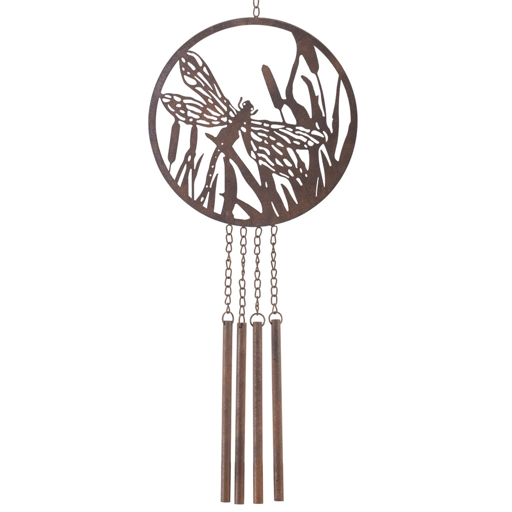 Adorn your yard with this adorable Dargonfly Wind Chime. Measuring 33" tall, this piece is sure to bring a whimsical touch to your spring and summer outdoor decor. The quality iron metal composition paired with the distressed bronze finish and delicate cut-out dragonfly insect and pond cattail accents, is the perfect combination to create a memorable display. With a chain for easy hanging, display this piece on your porch or patio to share the beauty and musical chimes will your visitors.