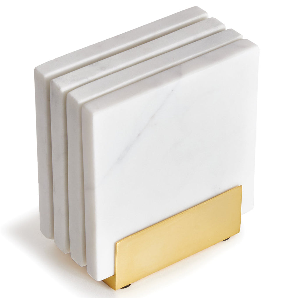 Nothing says cool sophistication like white marble. Keep this set of 4 coasters around the house and protect your furniture in style. Place in the simple brass holder when not using.