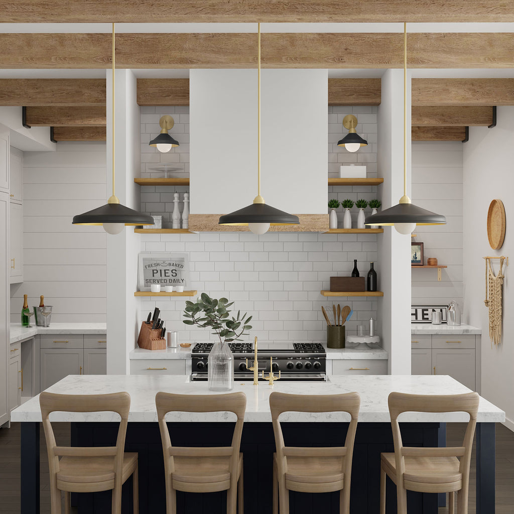 The classic style of Contemporary Farmhouse is embodied by the Brooks Barn Light Collection and the Brooks 18-inch Adjustable Barn Light 1-Light Pendant. With sleek features of a matte black dome exterior with gold leaf interior and included G40 globe bulb, use these pendants in pairs and trios over a kitchen island or dining table. Consider placing two or three throughout a living room at differing heights over a side table, book shelf, and coffee table for a playful visual dance through the room.