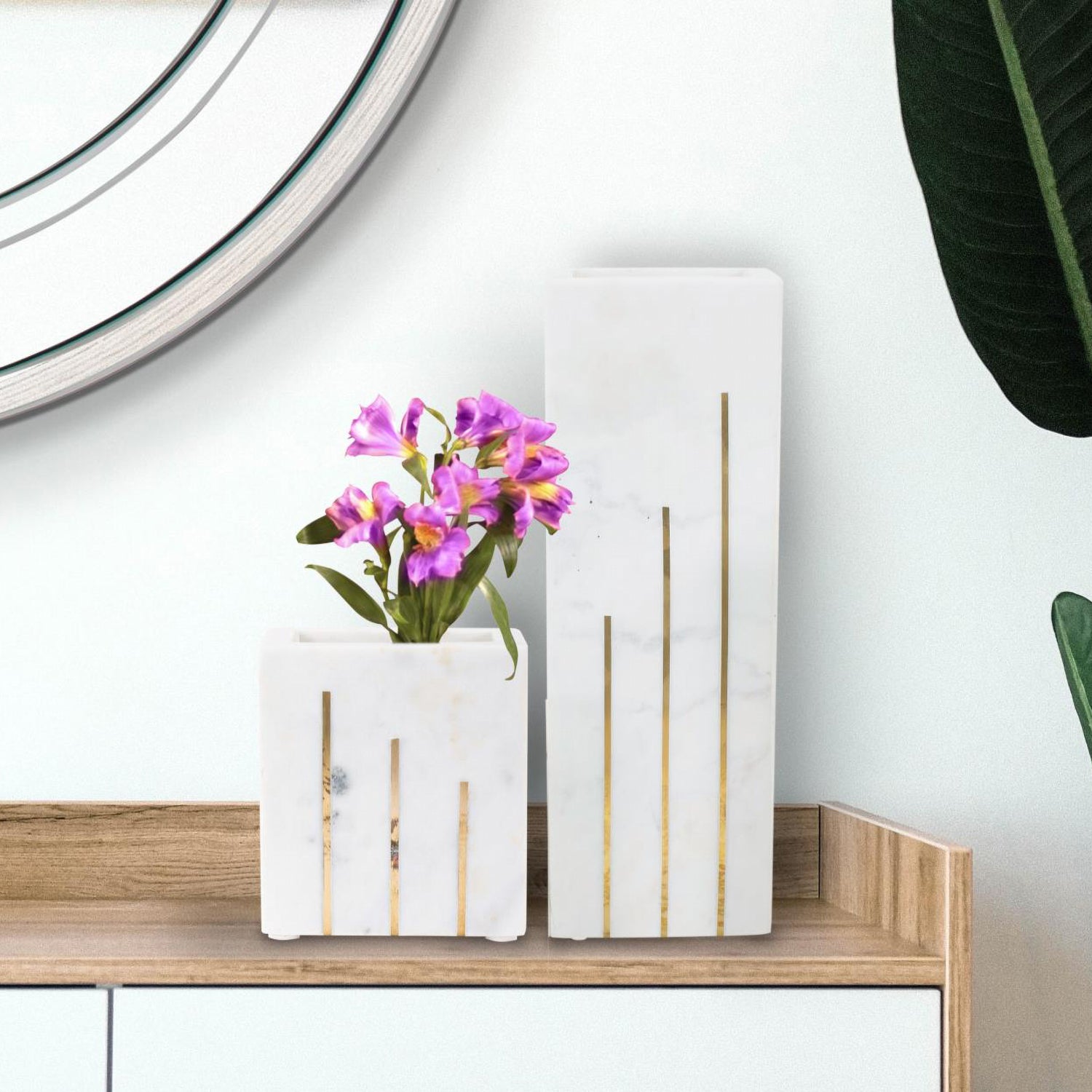 Flashback to the opulent style of post modern Italy, with sleek designs and all combinations of materials. The inlaid pattern of the graduating lines of brass accents perfectly compliments these sleek rectangular marble vases