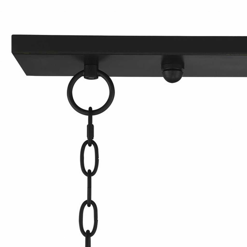 Impressive scale defines this oval-shaped chandelier, finished in oil-rubbed bronze. Designed for use over a kitchen island or rectangular dining table, this quiet statement-maker feels very at home in amodern farmhouse or industrial space–or in a home where a vintage influence is sought. The six lights are dimmable for added versatility. Includes two 6-foot chains to adjust height.