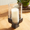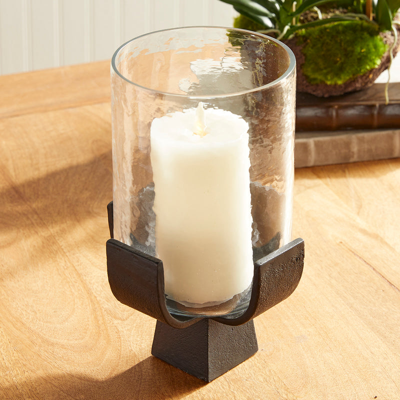 A sturdy bronze modern form cradles a glass cylinder of hammered glass. As sculptural as it is functional. Just add a candle for a warm glow.