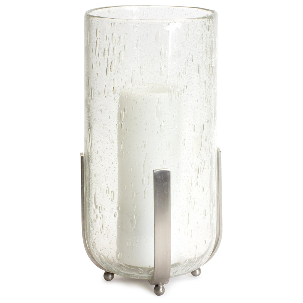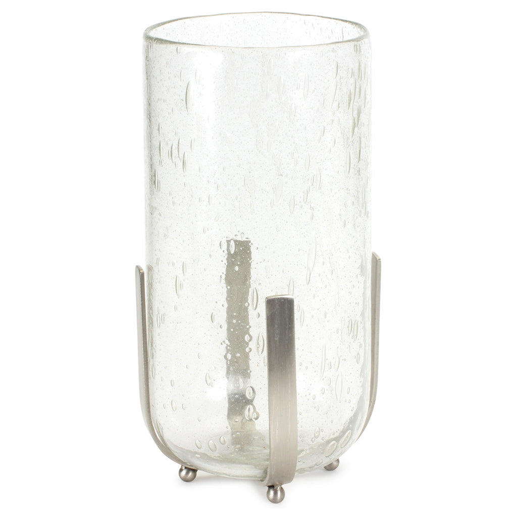 Add a chic touch to your home with this stunning Iron and Glass Candle Holder. The chic silver finish paired with the bubble glass insert is the perfect combintion to create a stylish display. The quality iron metal composition is sure to last for seasons to come. Illuminate the piece with a real wax or LED candle.