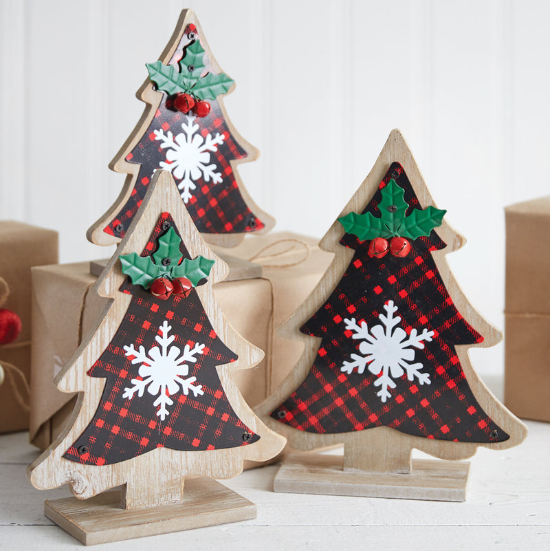 Enjoy the cozy feeling of buffalo plaid when you add these tabletop trees to your Christmas decor. You will add dimension to a table with each tree being a various size. Trees are made of wood with metal accents on the front.