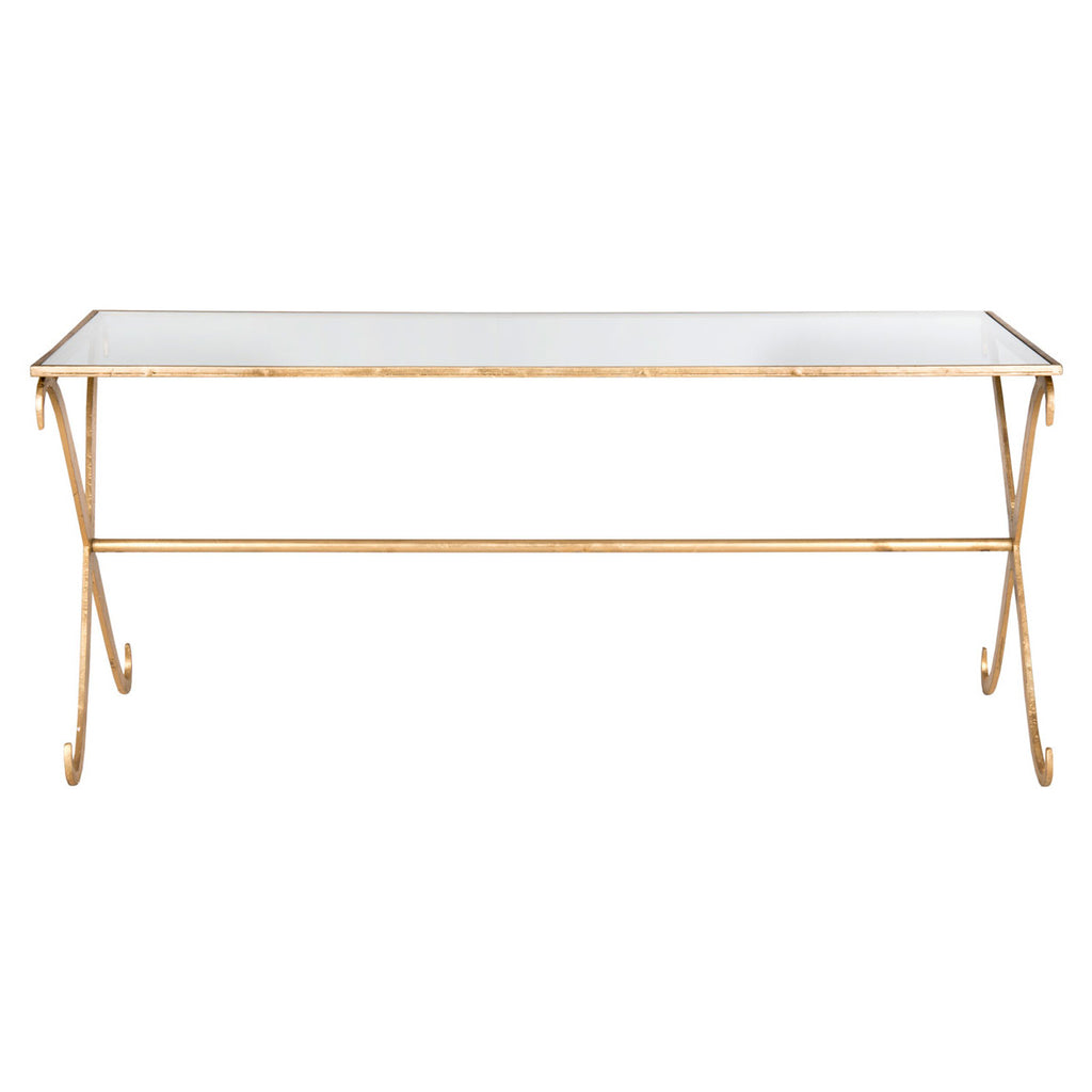 A classic beauty with a touch of whimsy, this coffee table features crossed legs finished with Venetian-inspired curlicues. Crafted of solid iron with gold leafing protected with lacquer, this striking piece is topped with clear tempered glass.