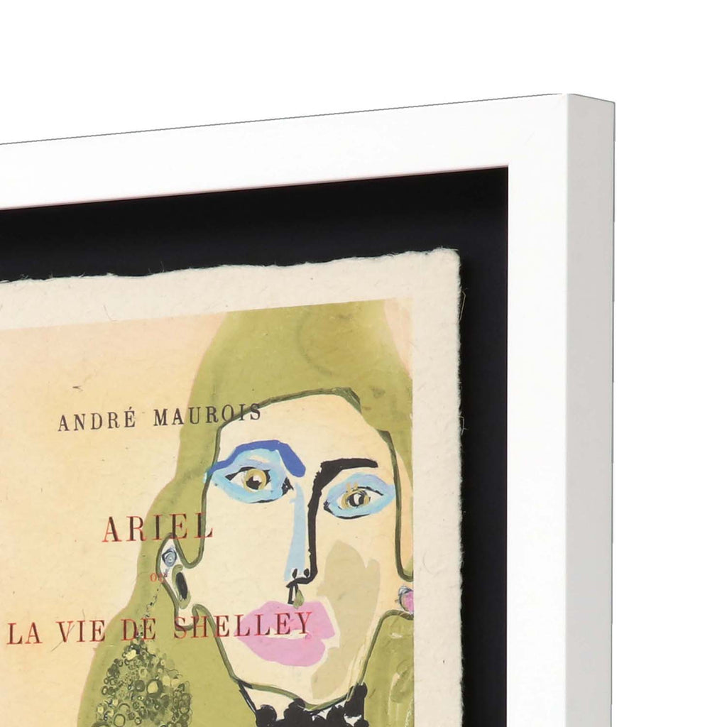 Vintage modern art designs on handmade papers are float mounted on black. Framed in a lacquered white wood shadow box style molding. Sold as set of four.