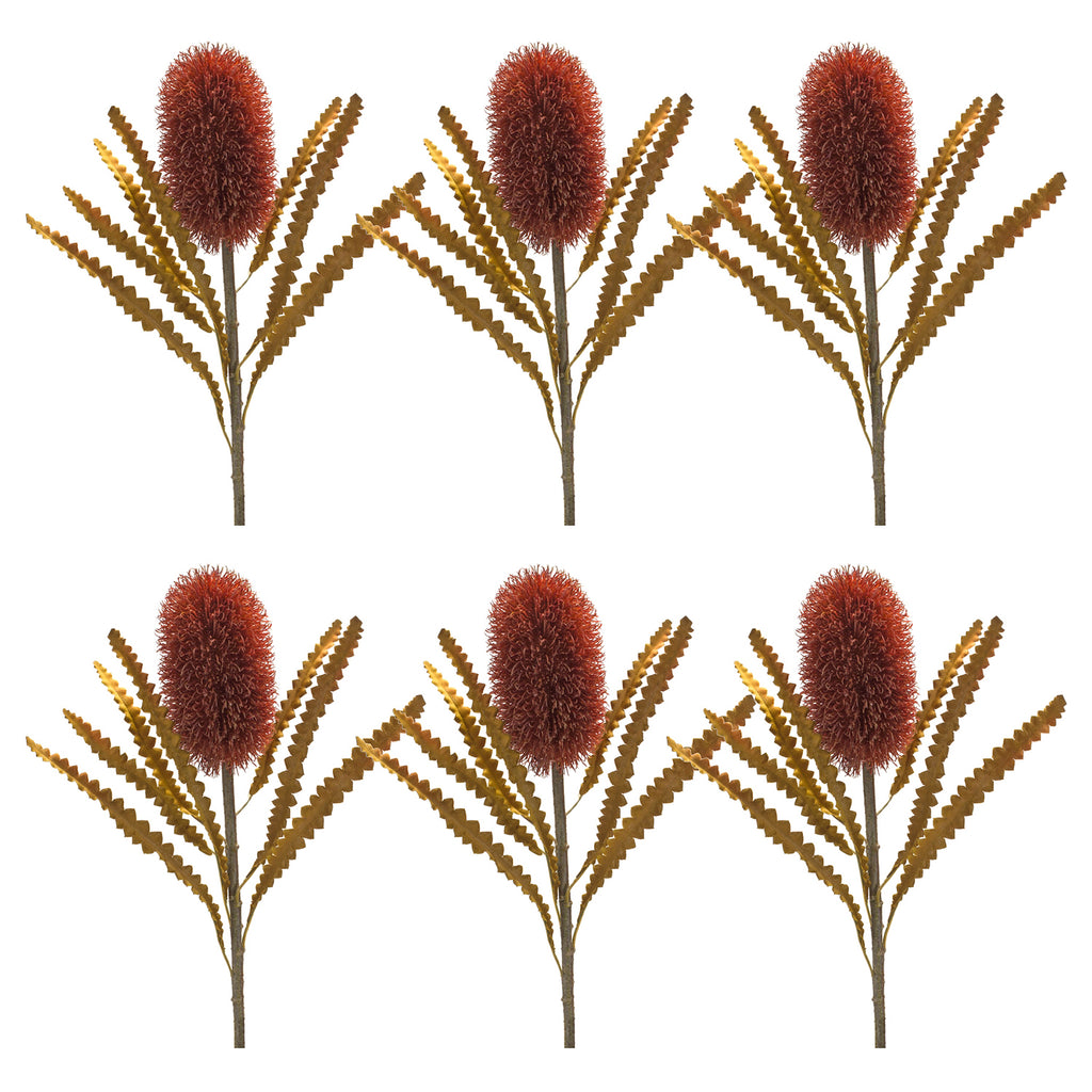 Add a pop of natural color to your home with this beautiful Banksia Stem. Featuring 6 pieces, this set's Banksia flowers paired with the assorted foliage accents makes this piece the perfect addition to your home decor. The quality plastic flowers and leaves are sure to last for seasons to come. Display the piece in a vase or decorative container to complete the look.