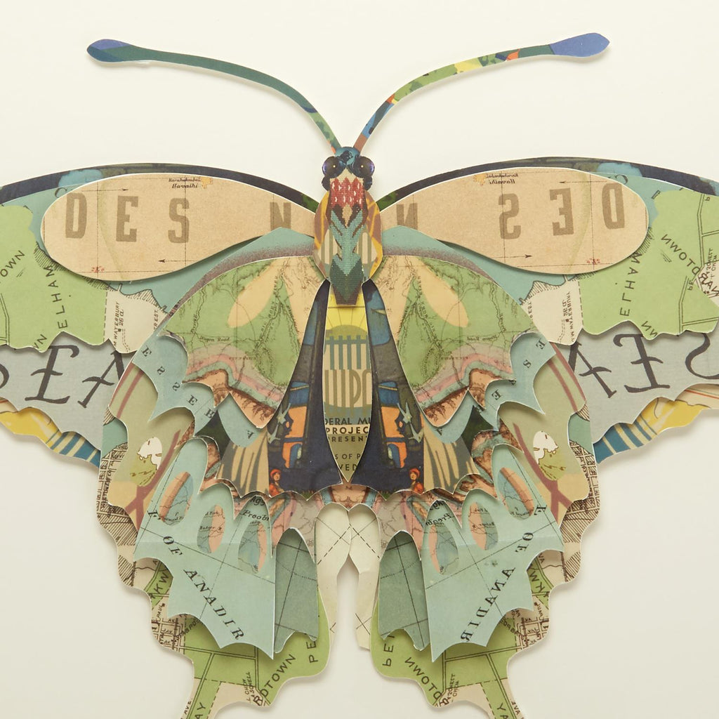 This multi-level collage butterfly piece is handcrafted with scraps of old papers, maps and artworks. Finished in a beautiful natural wood shadowbox.