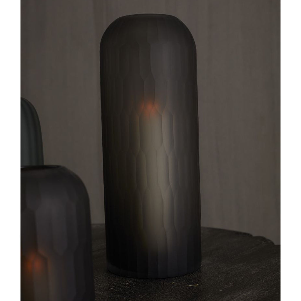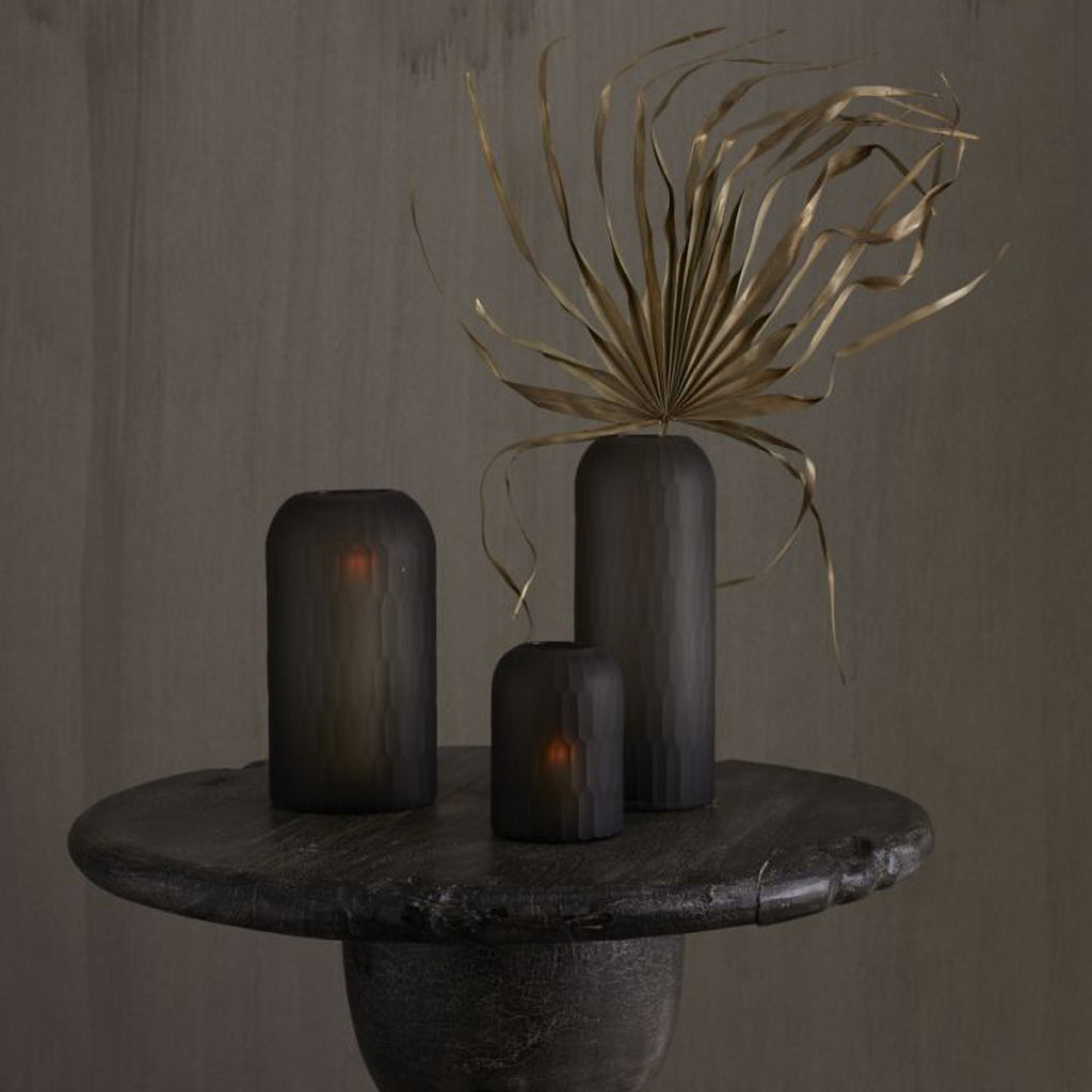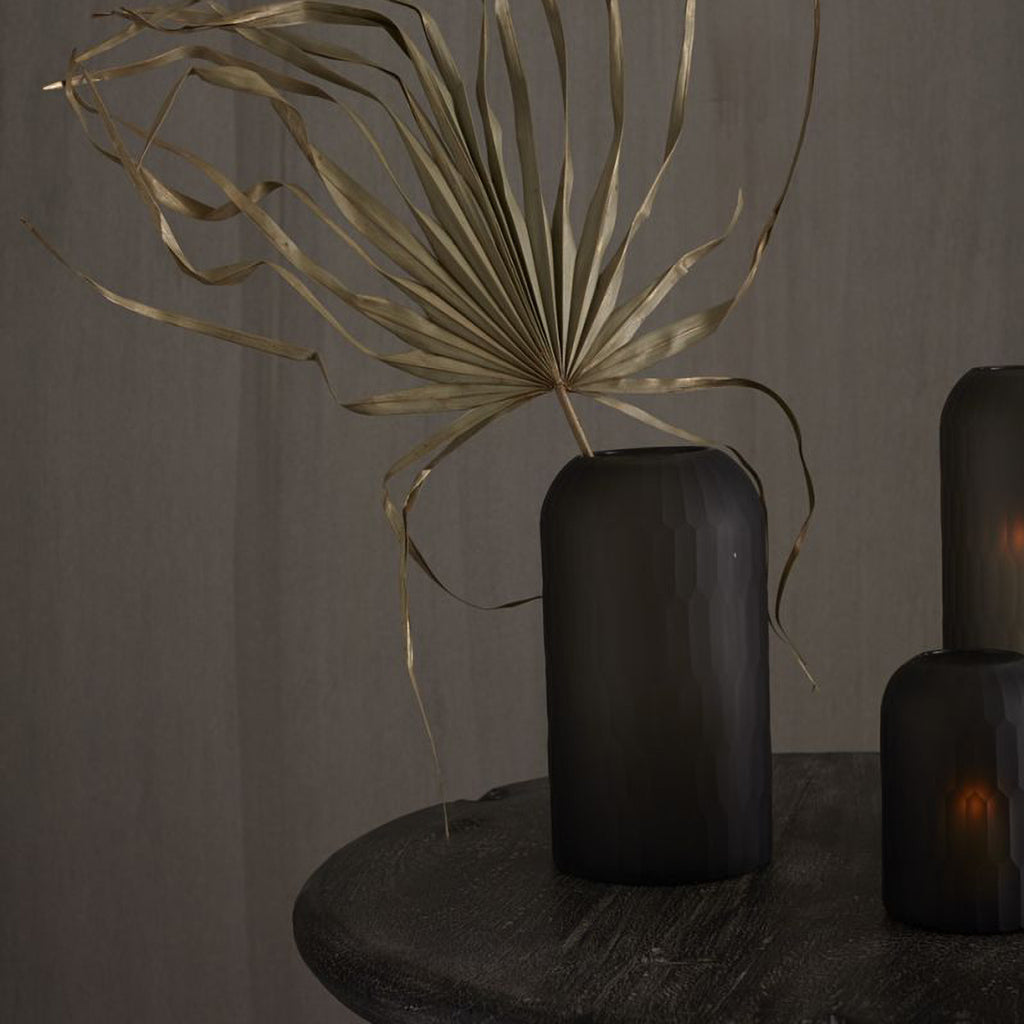Add a candle to this smoky charcoal dome vase for a mellow, moody vibe, like a black sand beach at sunset. Add florals for a contrasting pop of color. Mouth blown & hand cut with a textured exterior, this glass vase gives an earthy lift to any decor.