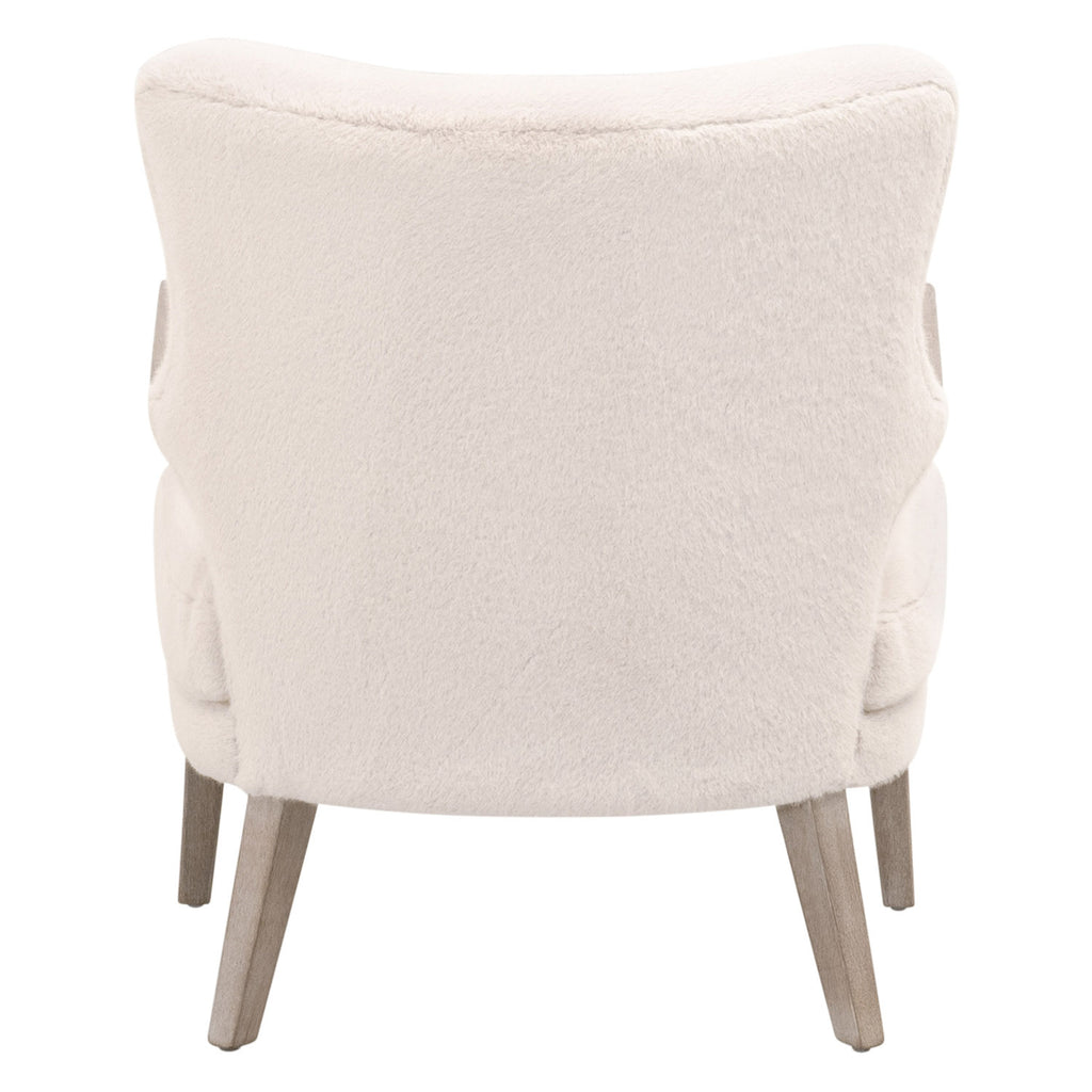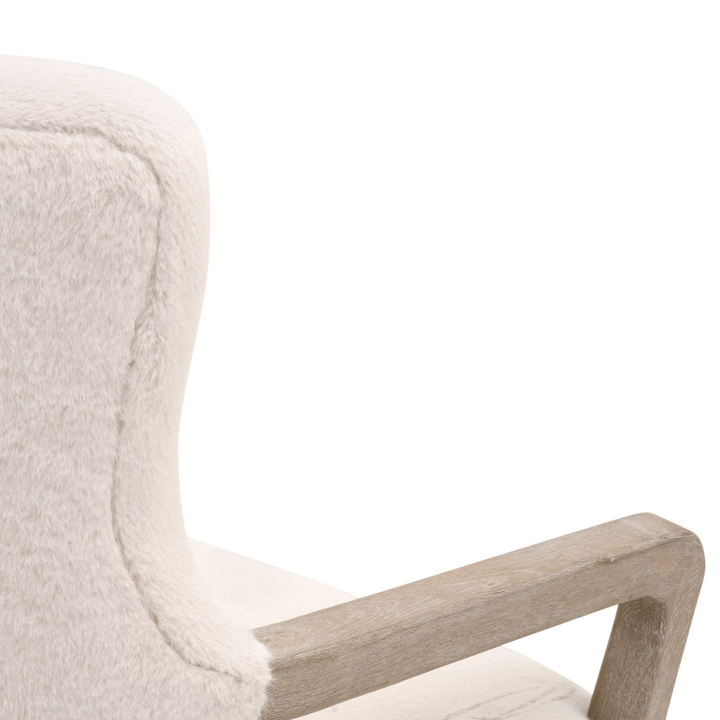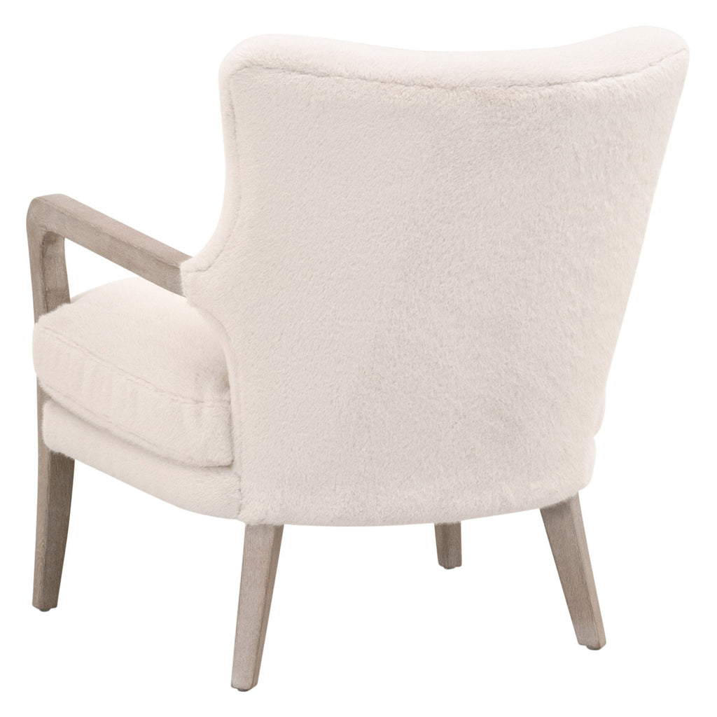 This stylish and sleek Calvin Club Chair by Essentials For Living is designed with a modern and elegant look. Its faux fur cream upholstery is textured and light in color. The seat cushion was thoughtfully designed and is removable for cleaning and fluffing purposes. Additionally, this chair has an appealing silhouette with a curved wingback and exposed oak wood arms. It measures 29.25in wide, 32in deep, and 34.5in high, with a seat height of 18in. This chair will make the perfect accent seating in any transitional style living space.