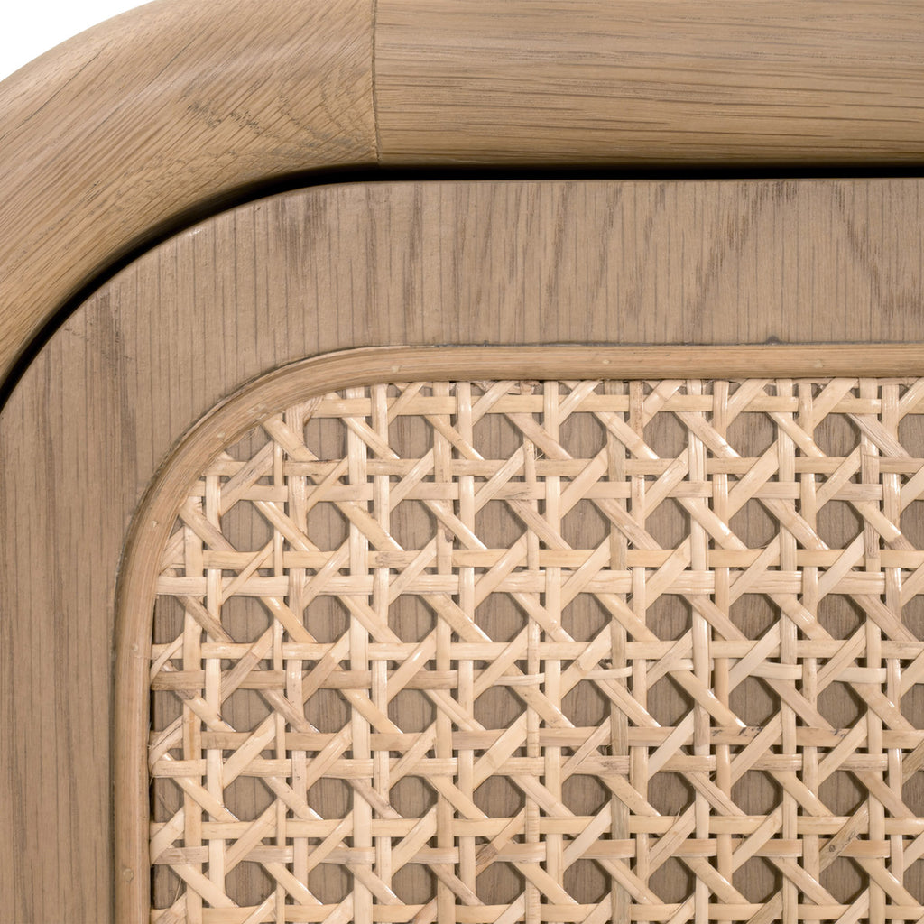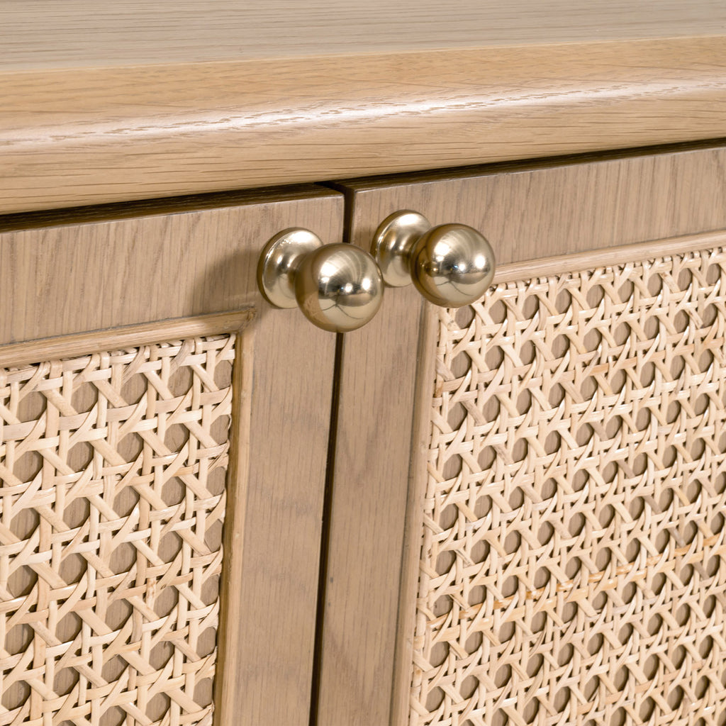 The Cannes Media Sideboard by Essentials For Living blends an organic and earthy allure with functional artistry. Its solid oak wood and oak veneer frame have a natural finish that exudes warmth. The cabinet doors feature intricately woven cane front inlays that add rustic sophistication. Rounded edges give this piece a soft look with mod style. Measuring 71.5" wide, 19" deep, and 32.5" high, it features four soft-close doors with sleek iron knobs in a polished brass finish, and magnetic closures. Housing two storage cabinets with removable, adjustable shelves and dual cord management holes, there is plenty of storage space. A center support leg and tip kit ensure stability, making this piece a stylish storage space for media essentials.