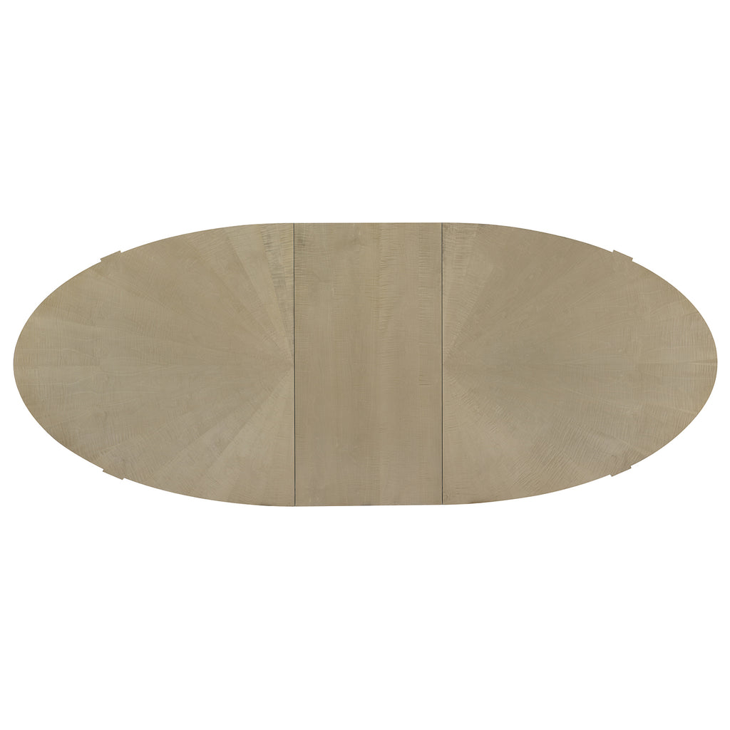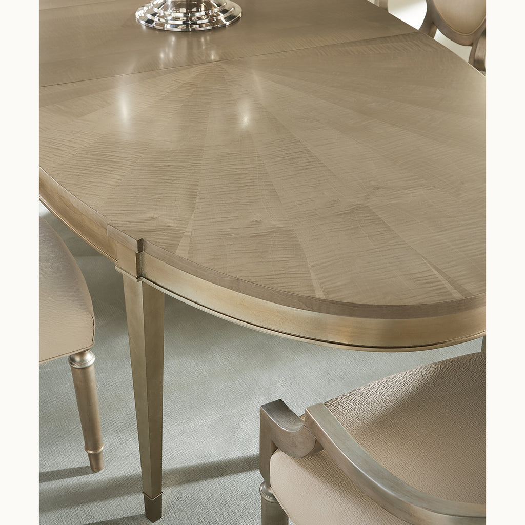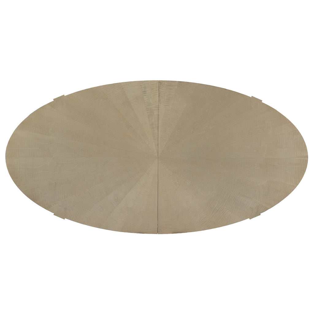 You’ll be inspired to gather friends and family more often with this lovely oval dining table. Its exquisite top features radial-matched Fumed Figured Tiger Maple veneers and is finished in Smoke with Taupe Silver Leaf accents. Ensuring room for everyone, the table extends to 138 inches with its two 24 inch leaves. Metal ferrules adorn its legs for a dramatic finishing touch.